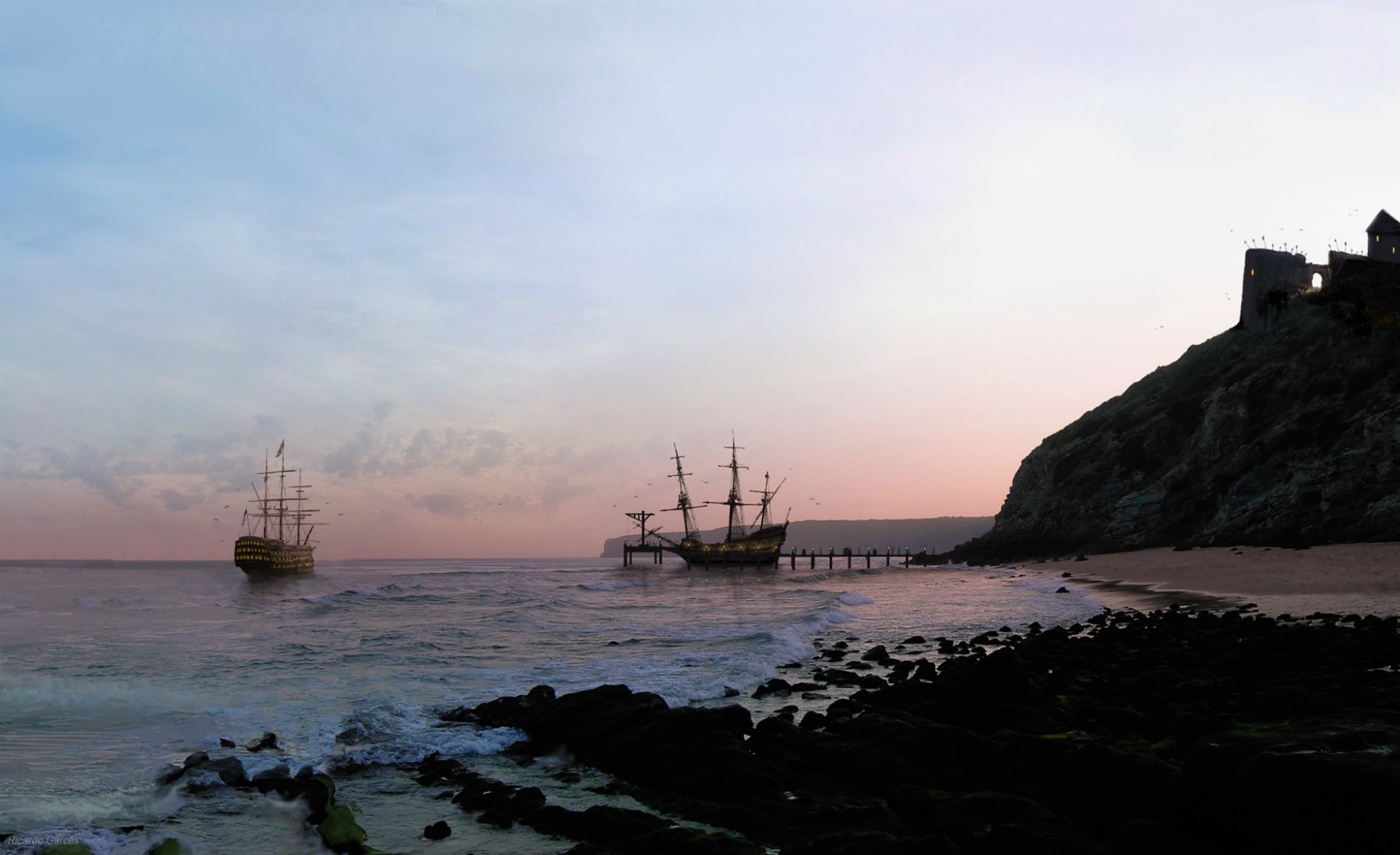 Description: Two ships are sailing in the ocean near a rocky shore and a castle on a hill in the distance.