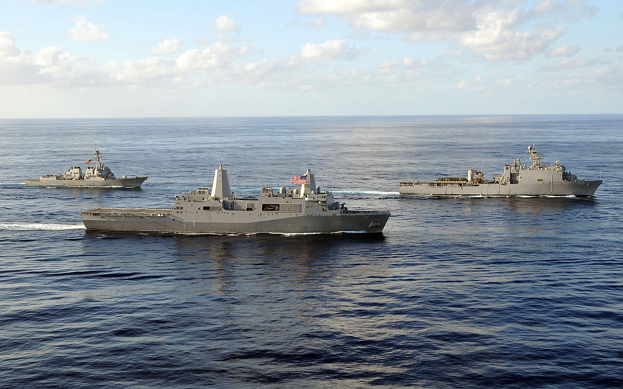 Description: A group of ships in the ocean with a sky background and clouds above them.