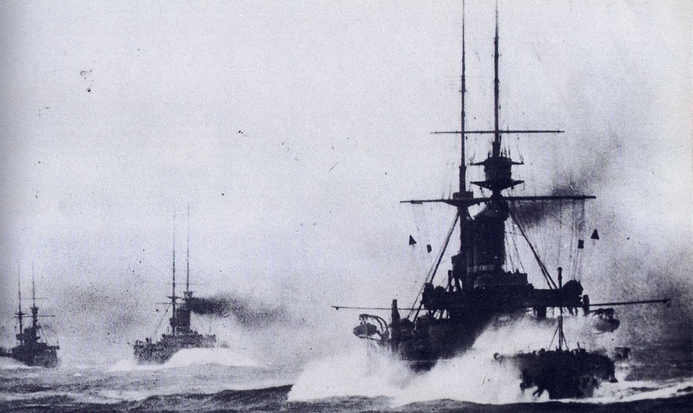 Description: A group of ships in the water with a sky background and a few clouds in the sky above them.