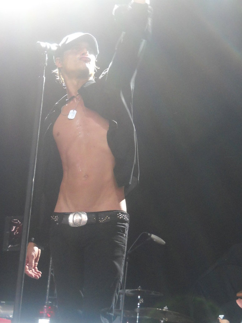 Description: A shirtless man with a microphone on stage with a band behind him and a microphone in his hand.