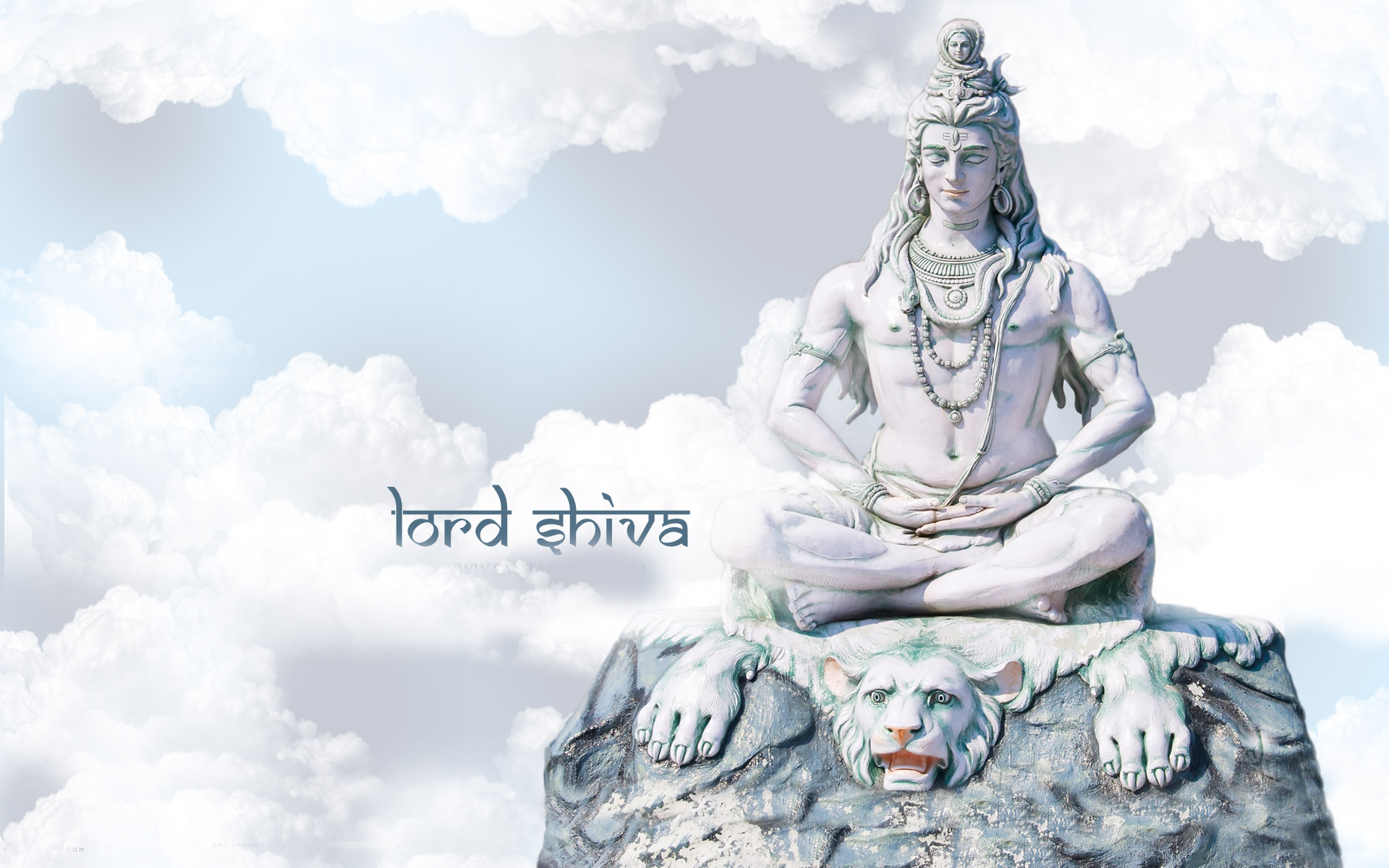 Description: A statue of lord shiva sitting on a rock with clouds in the background and a message written below it.