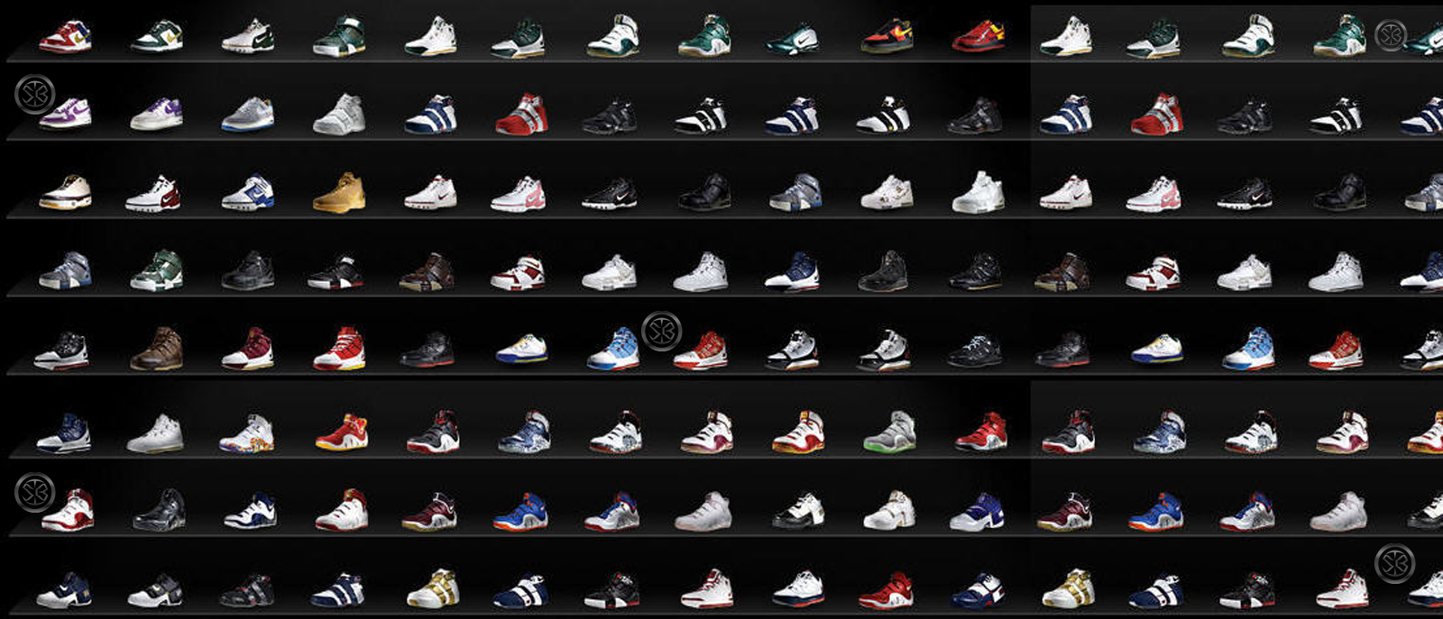 Description: A large display of shoes on a black background with a black background and a black background with a black background.