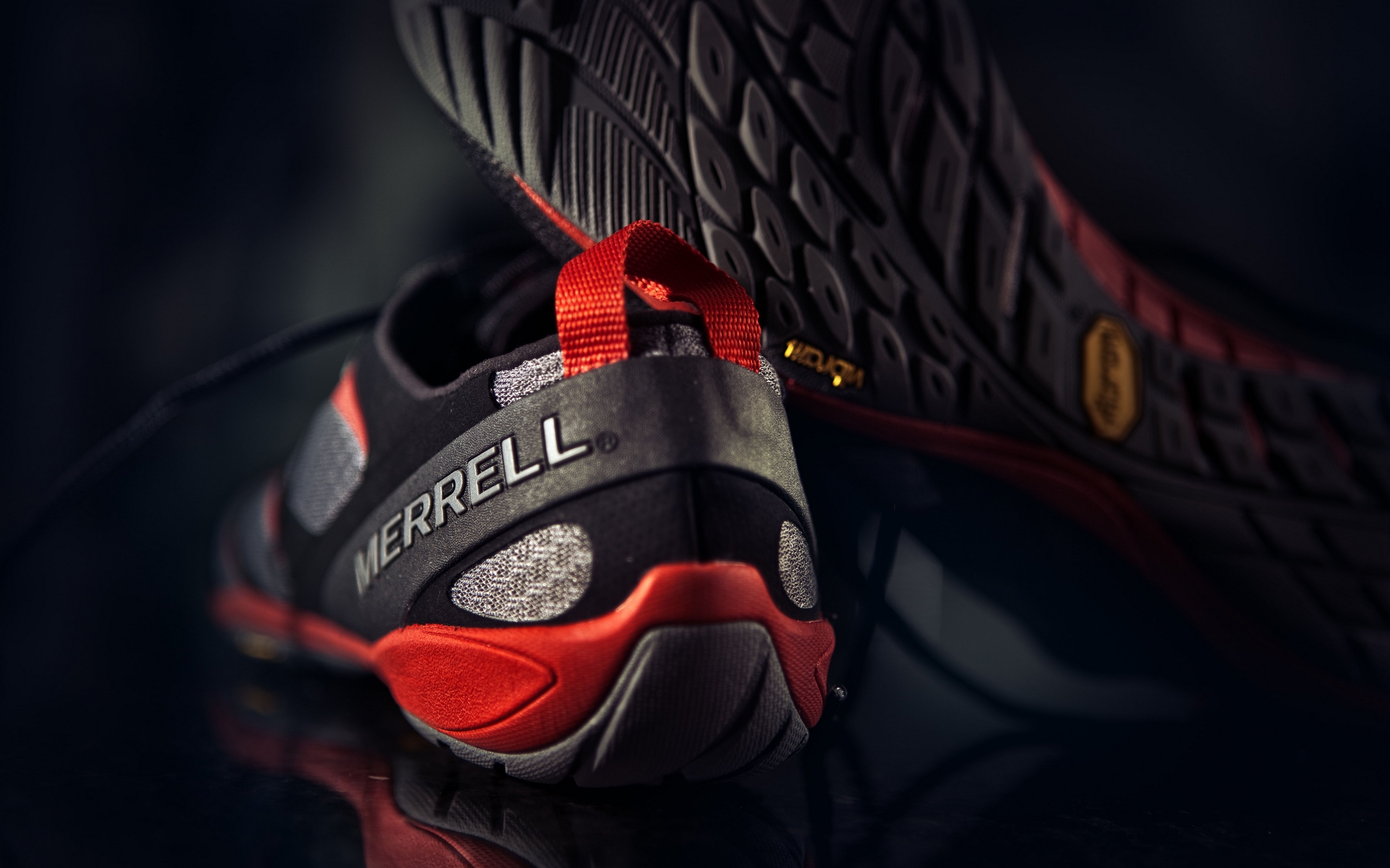 Description: A pair of shoes with red and black soles on a black surface with a black background and a red shoelace.