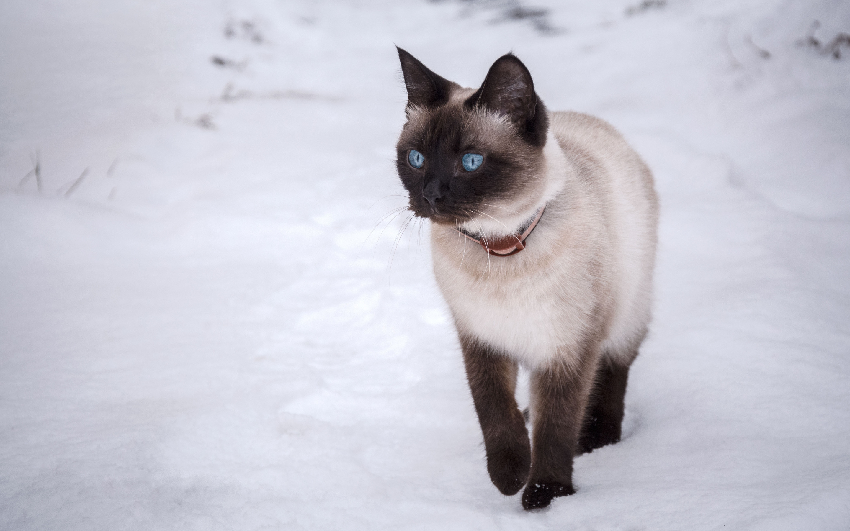 Description: A siamese cat walking in the snow with blue eyes and a smile on its face.
