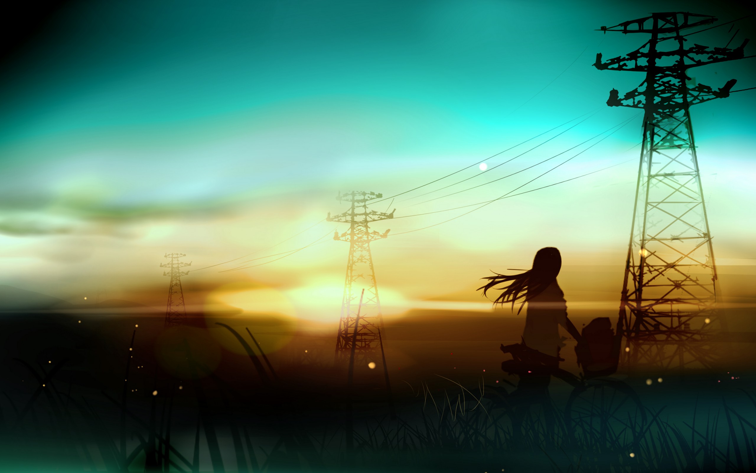 Description: A woman standing in a field with power lines in the background at sunset or dawn with a silhouette of a woman.