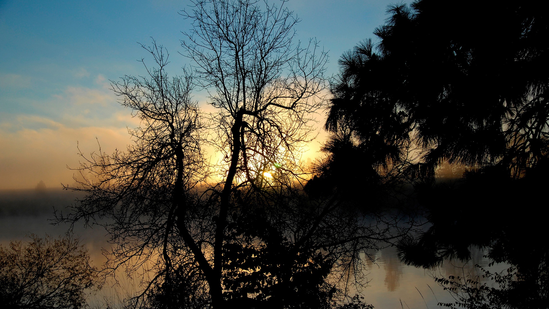 Description: A tree is silhouetted against a sunset over a lake with fog and water in the foreground and a few trees in the foreground.