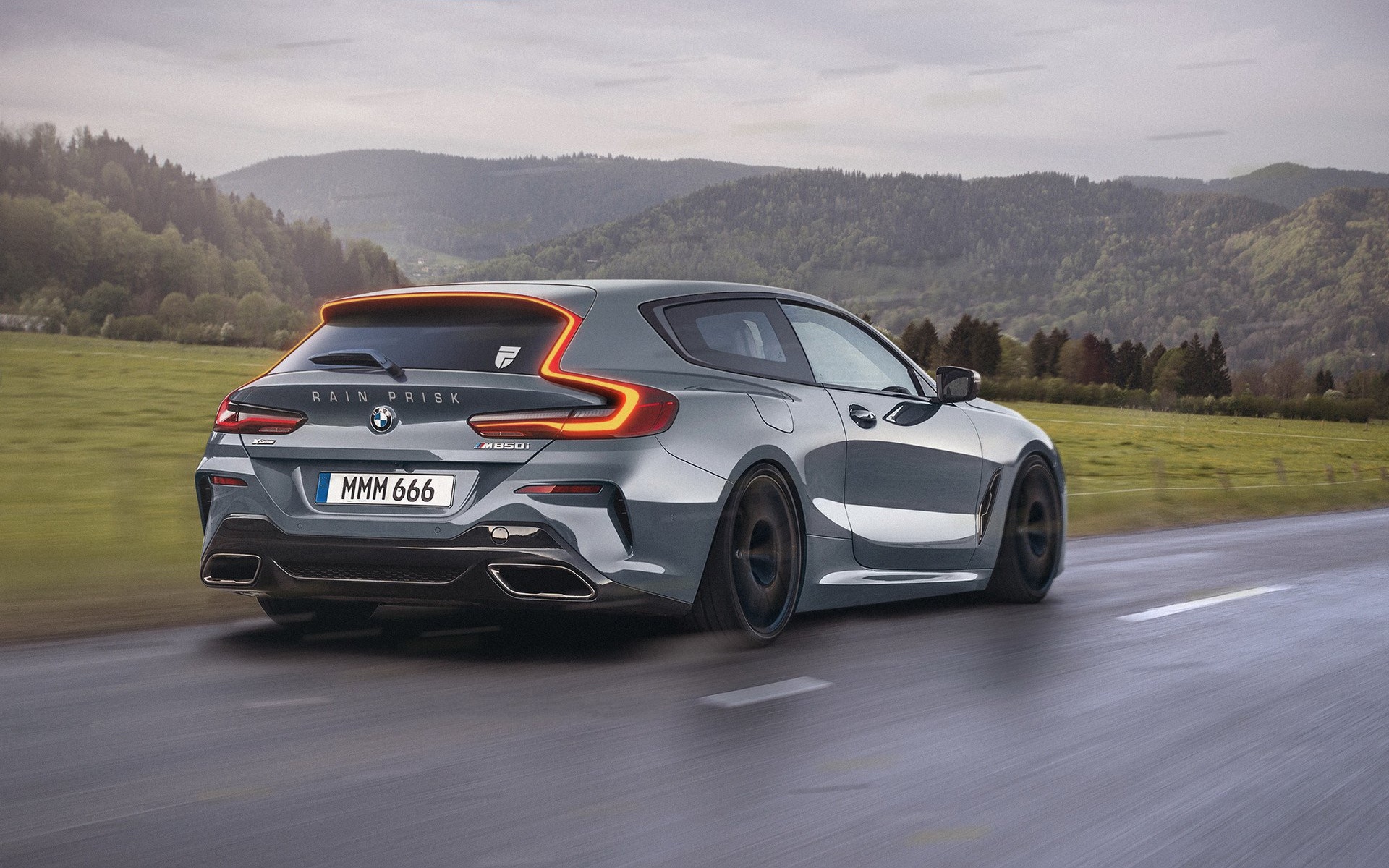 Description: A silver bmw car driving down a road with mountains in the background and a cloudy sky above it.
