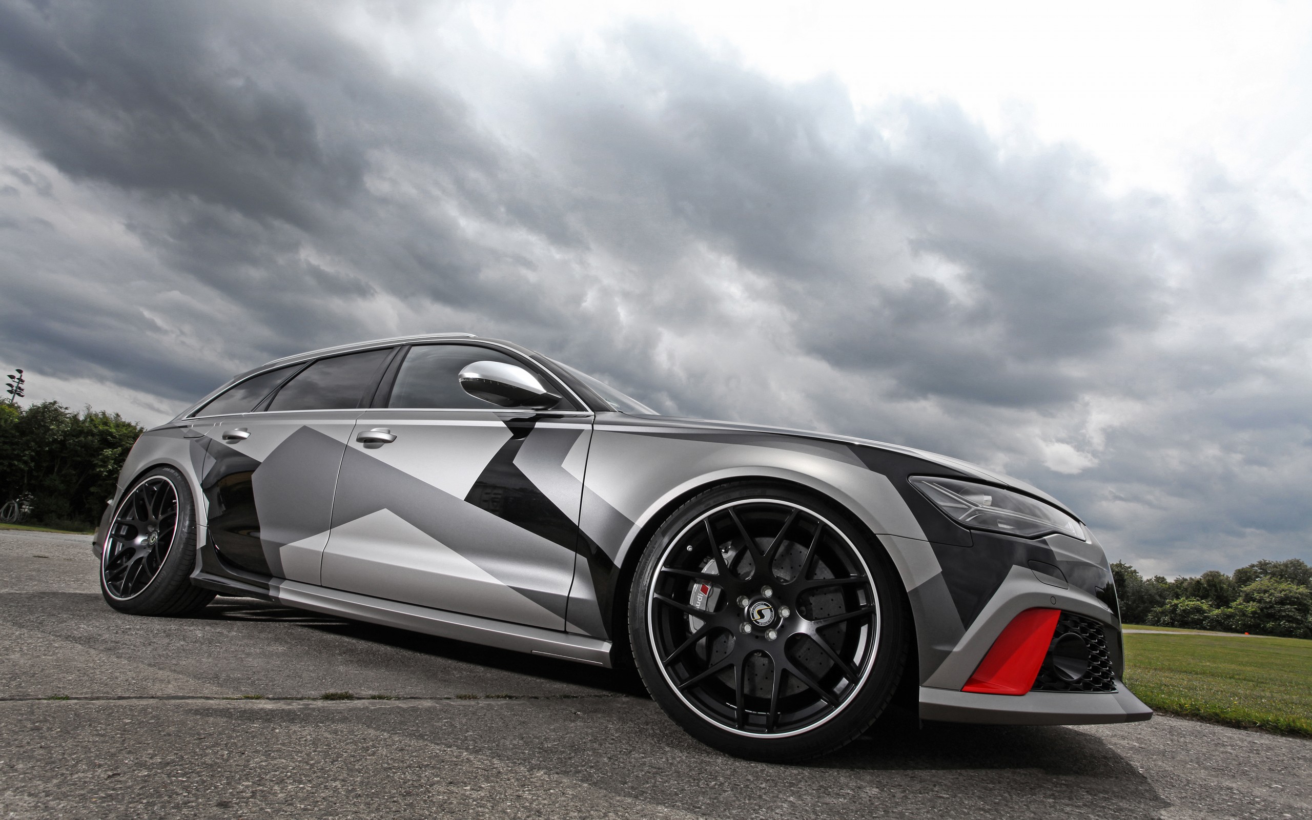 Description: A silver car with a black and red design on it's side parked on a road under a cloudy sky.