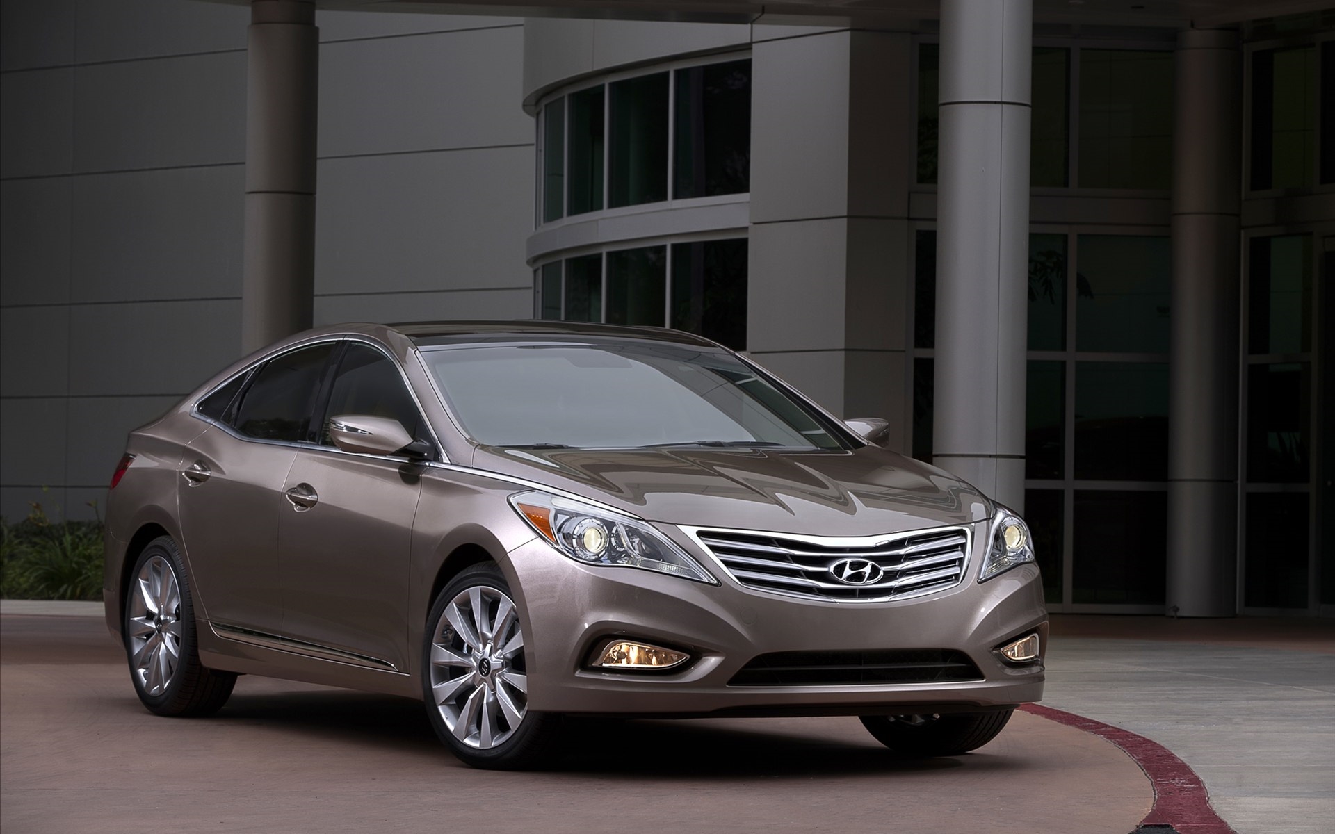 Description: A silver car parked in front of a building with a circular driveway and a circular driveway circle in front of it.