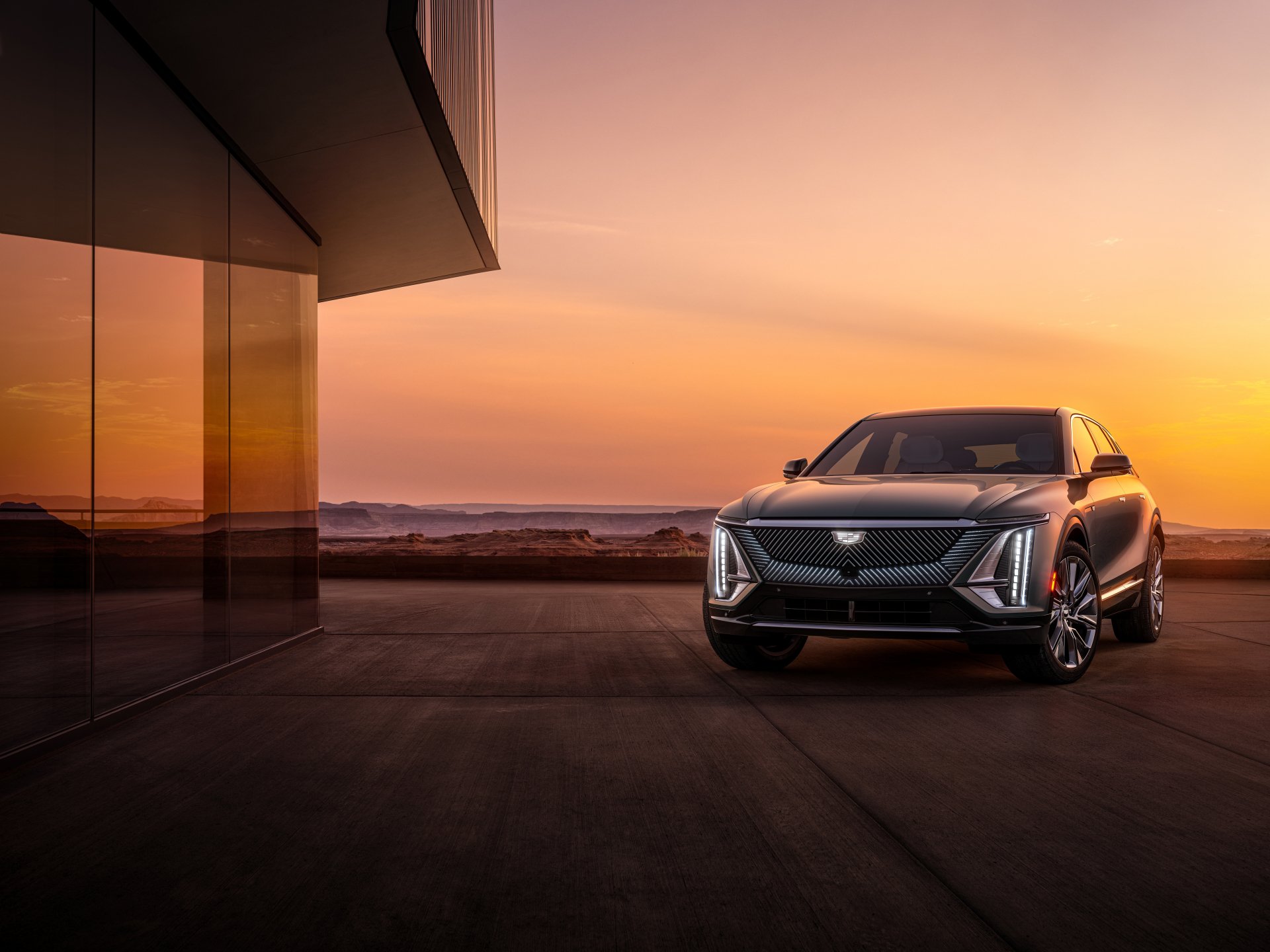 Description: A silver car parked in front of a building at sunset or dawn with the sun setting behind it and a building with a glass wall.