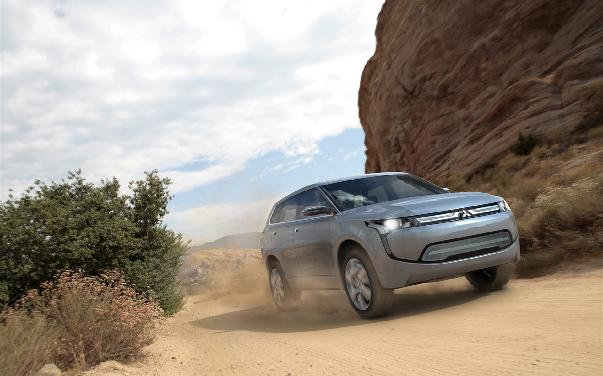 Description: A silver car driving down a dirt road next to a cliff and trees in the desert with a sky background.