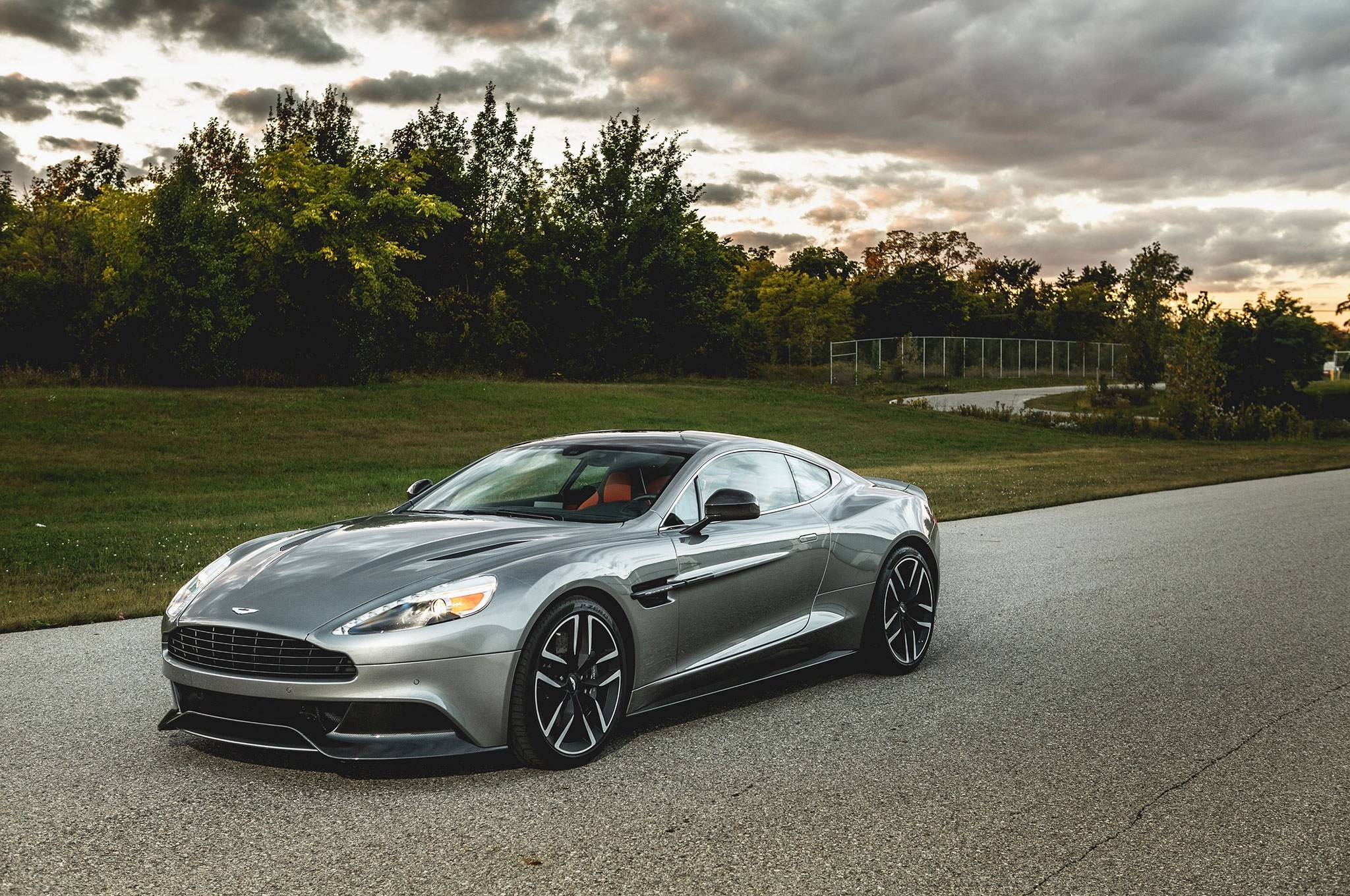 Description: A silver car driving down a road next to a forest and a cloudy sky with clouds in the background.