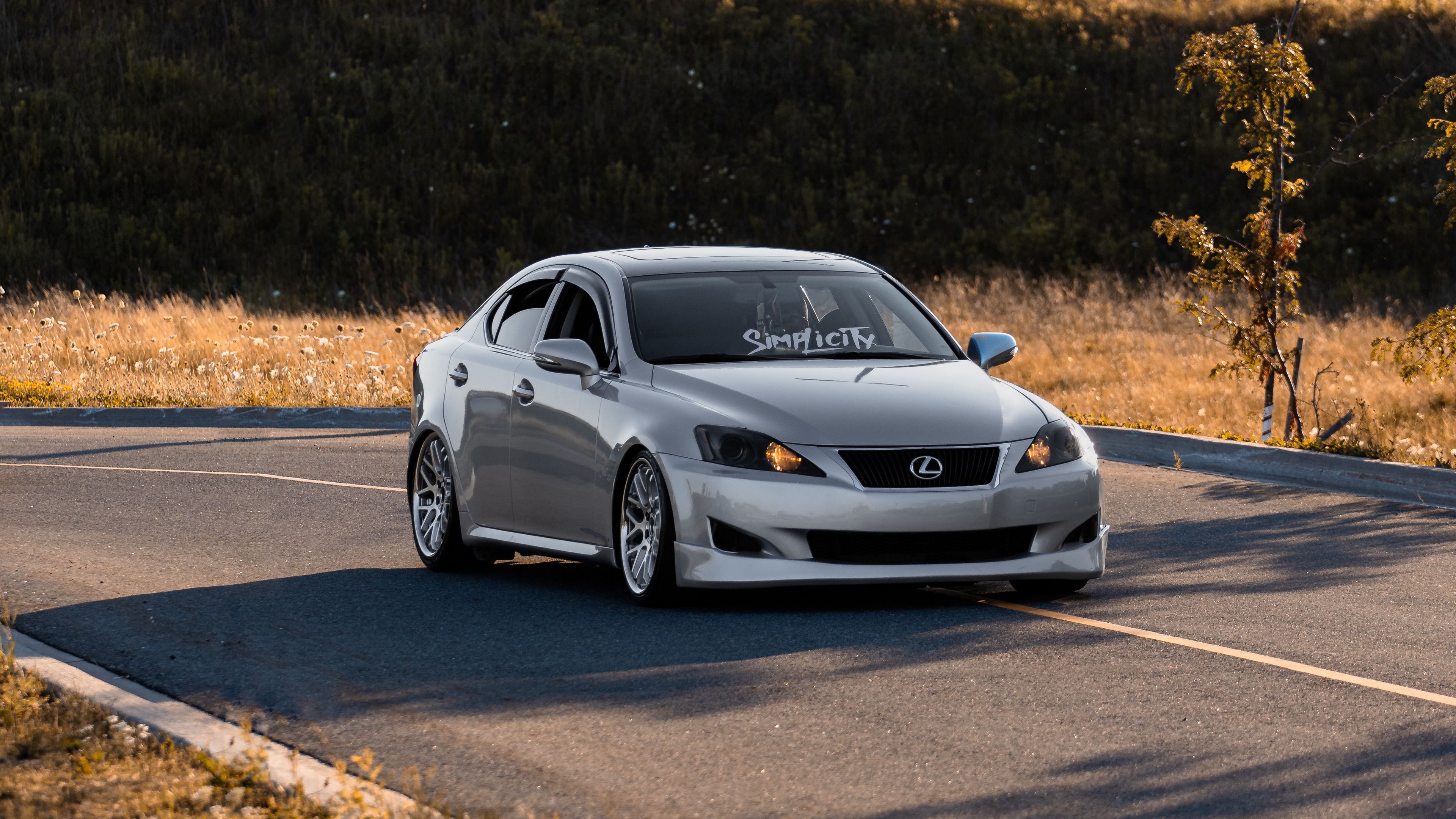 Description: A silver car driving down a road next to a forest and grass covered hillside with trees in the background.