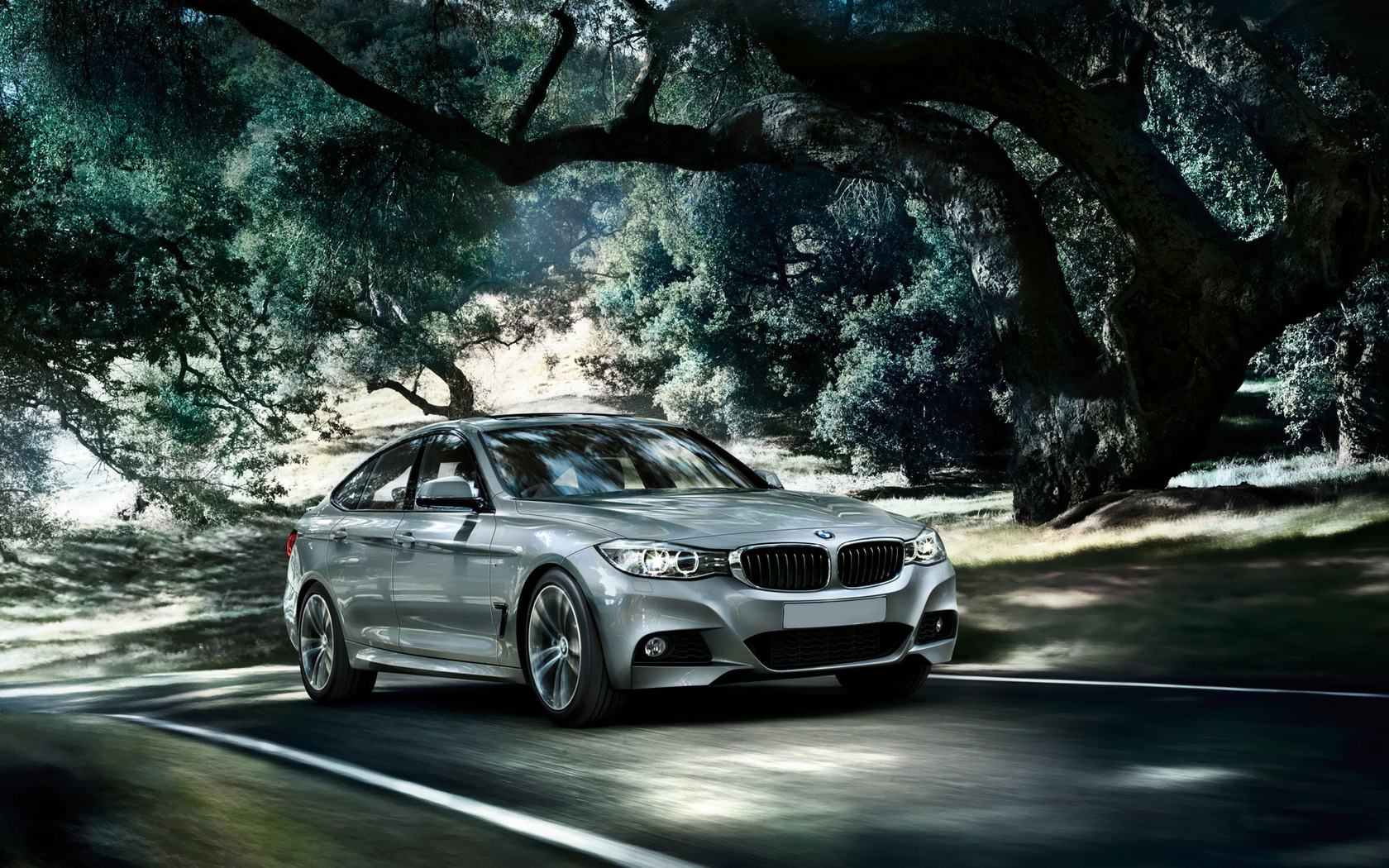 Description: A silver car driving down a road next to a forest filled with trees and grass on a sunny day.