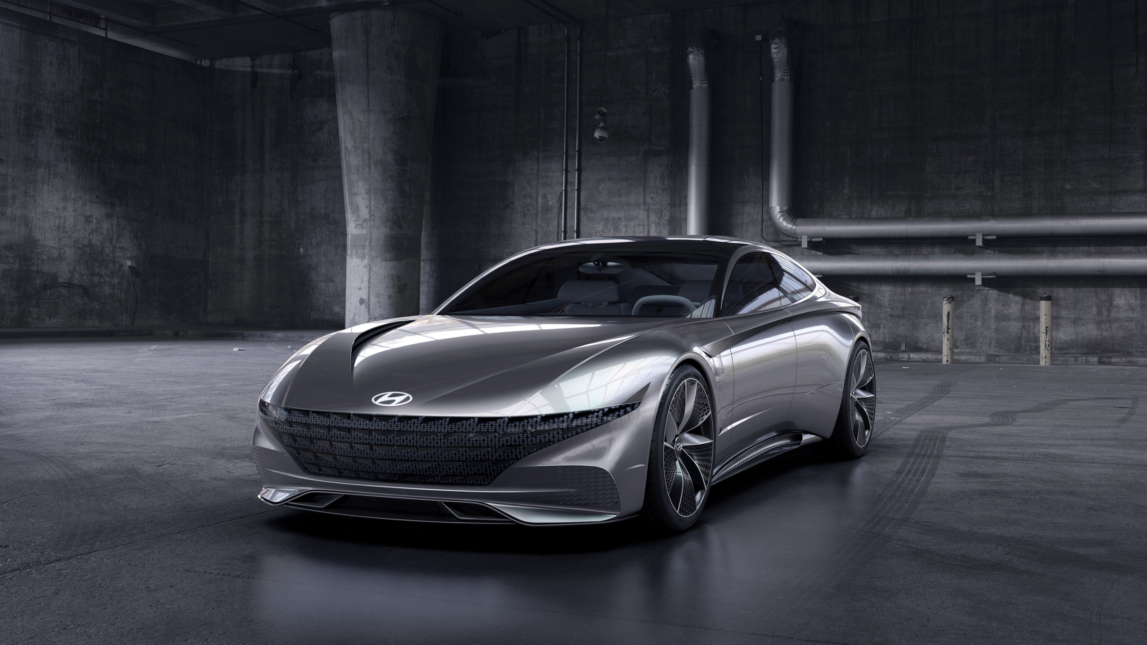 Description: A silver car is parked in a dark room with pipes on the wall and a black floor and a black floor.