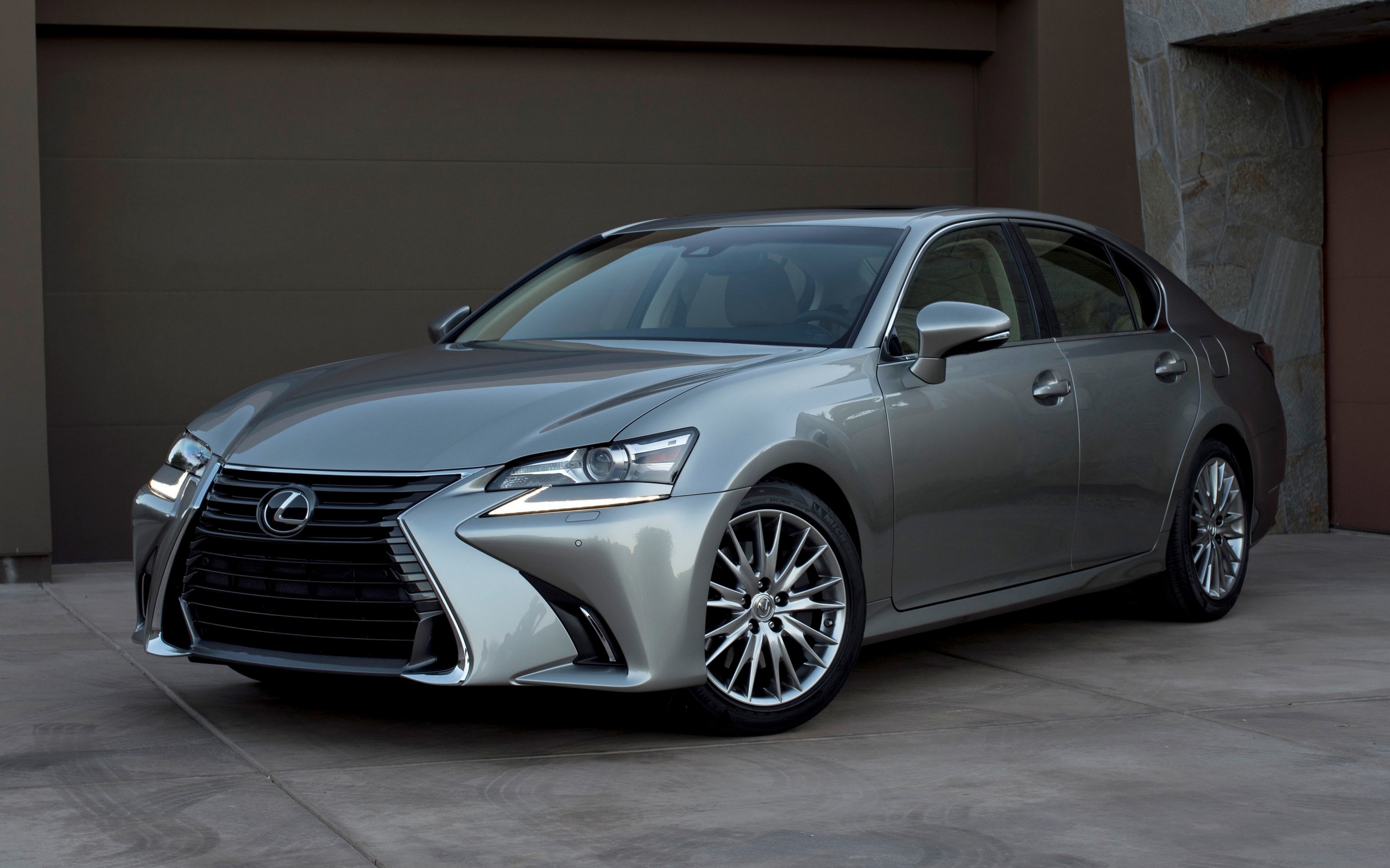 Description: A silver car parked in front of a garage door with a brown garage door behind it and a brown garage door behind it.