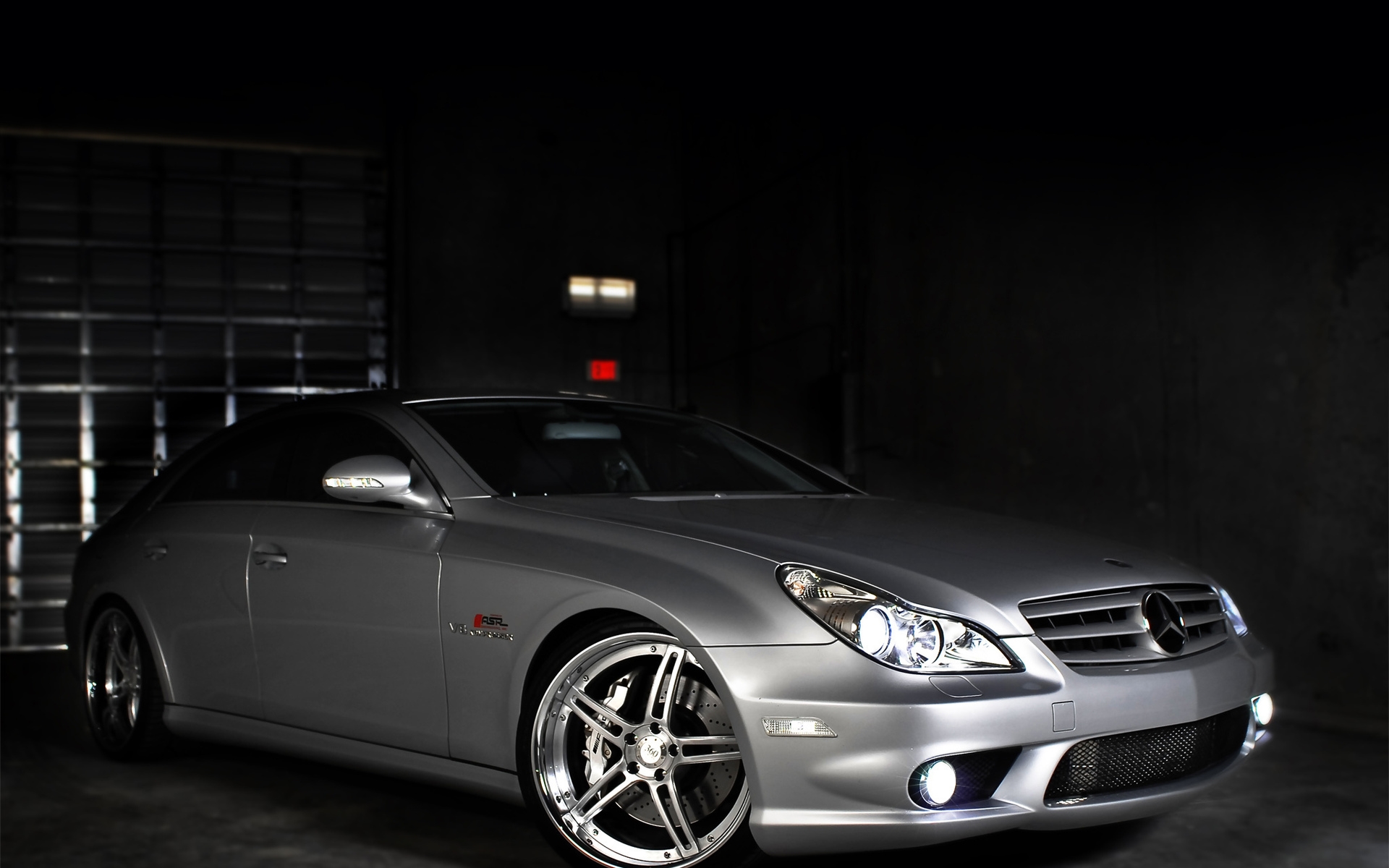 Description: A silver car parked in a garage with a red light on it's side window and a black background.