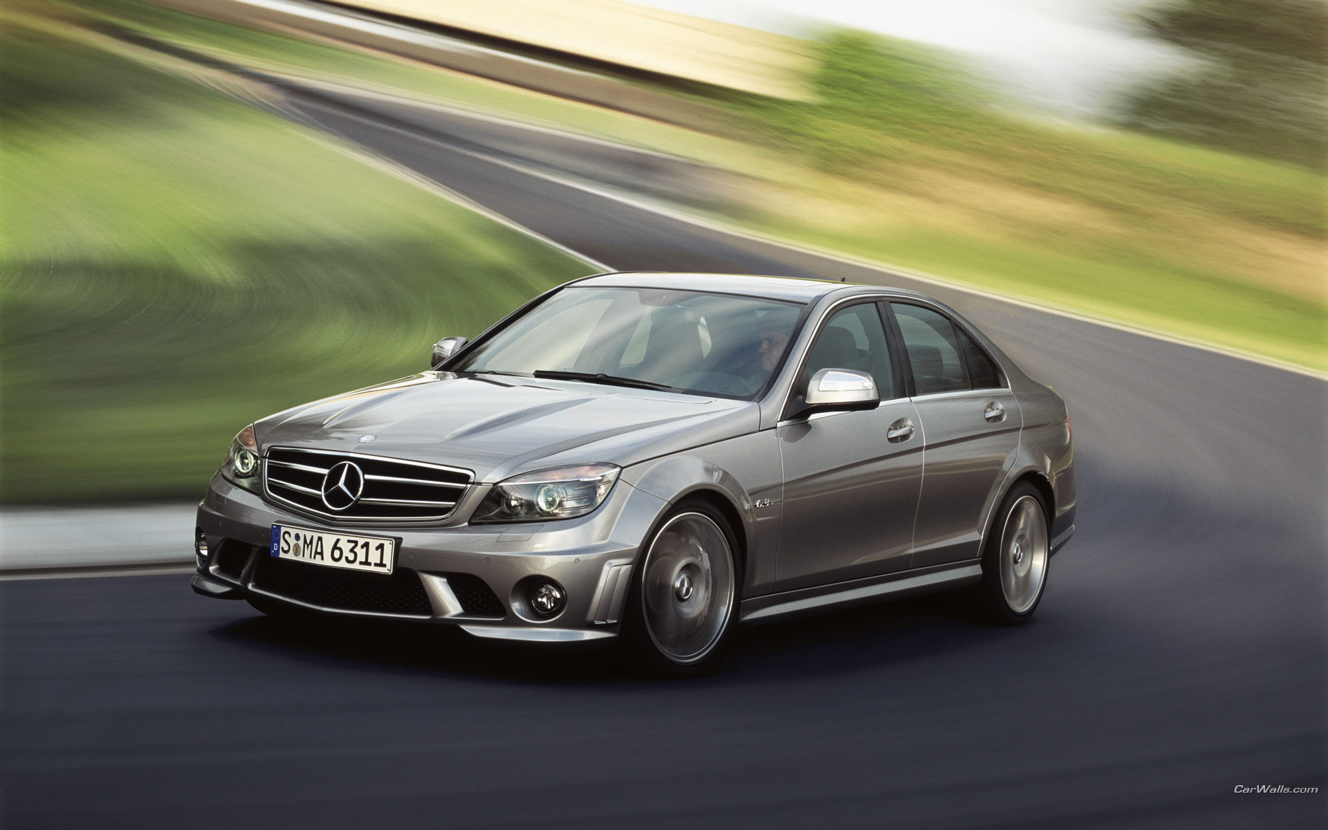 Description: A silver car driving down a road next to a lush green field and a lush green hillside in the background.