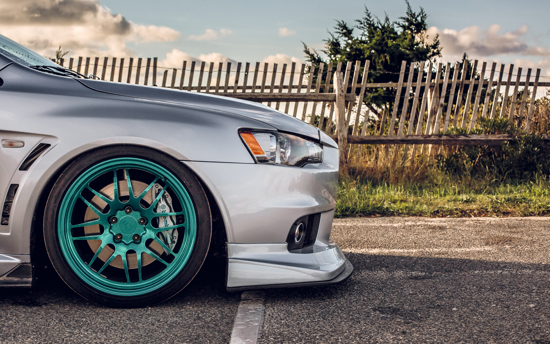 Description: A silver car with a green rim parked in a parking lot next to a fence and a wooden fence.