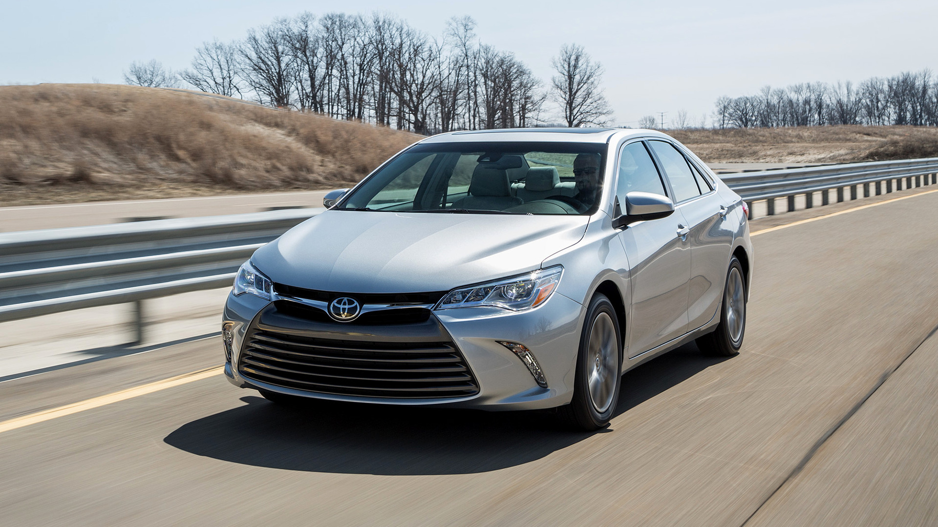 Description: A silver car driving down a highway next to a forest and a hill side with trees on the side of the road.