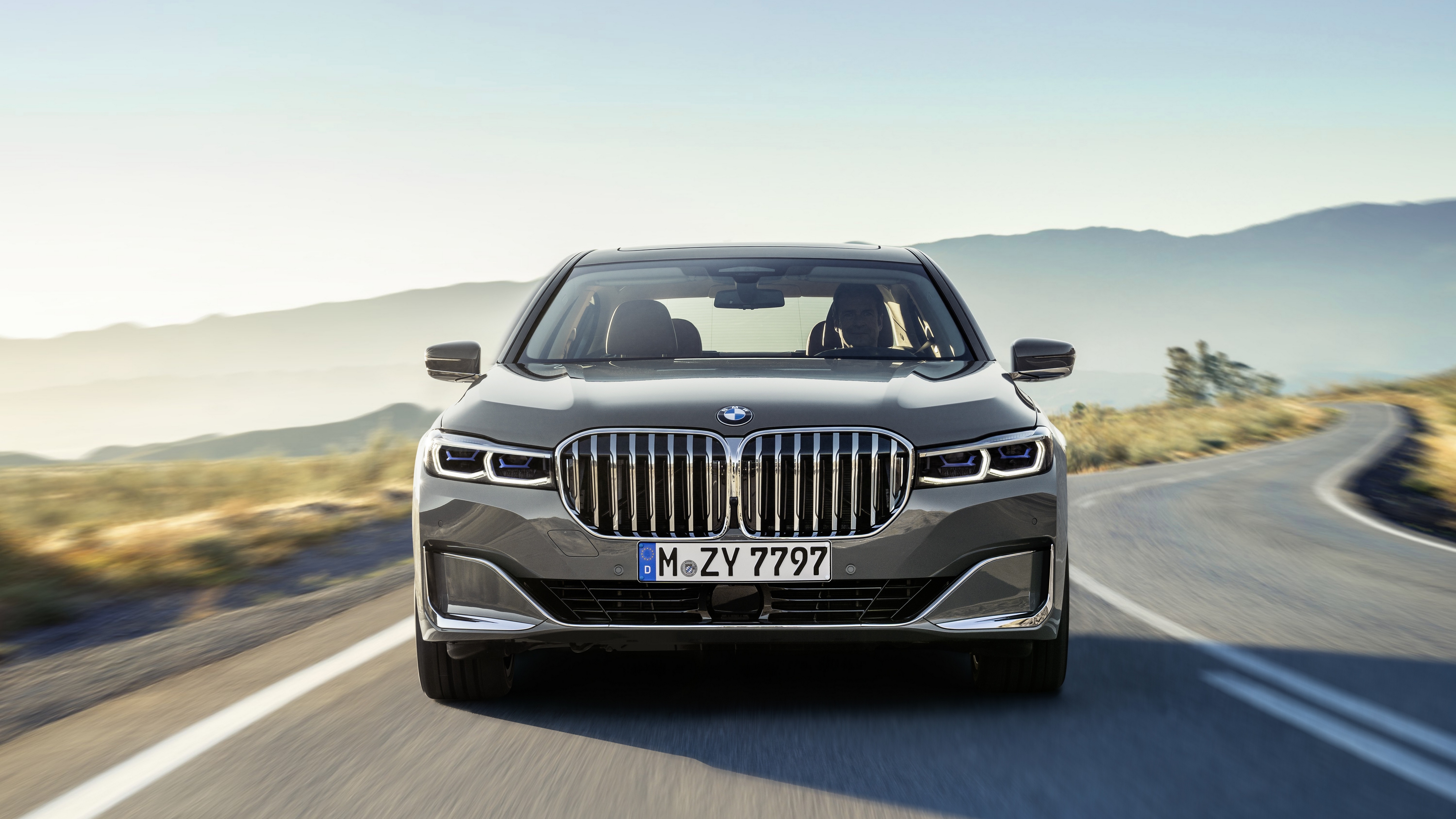 Description: A silver car driving down a road with mountains in the background and a sky background with a few clouds.
