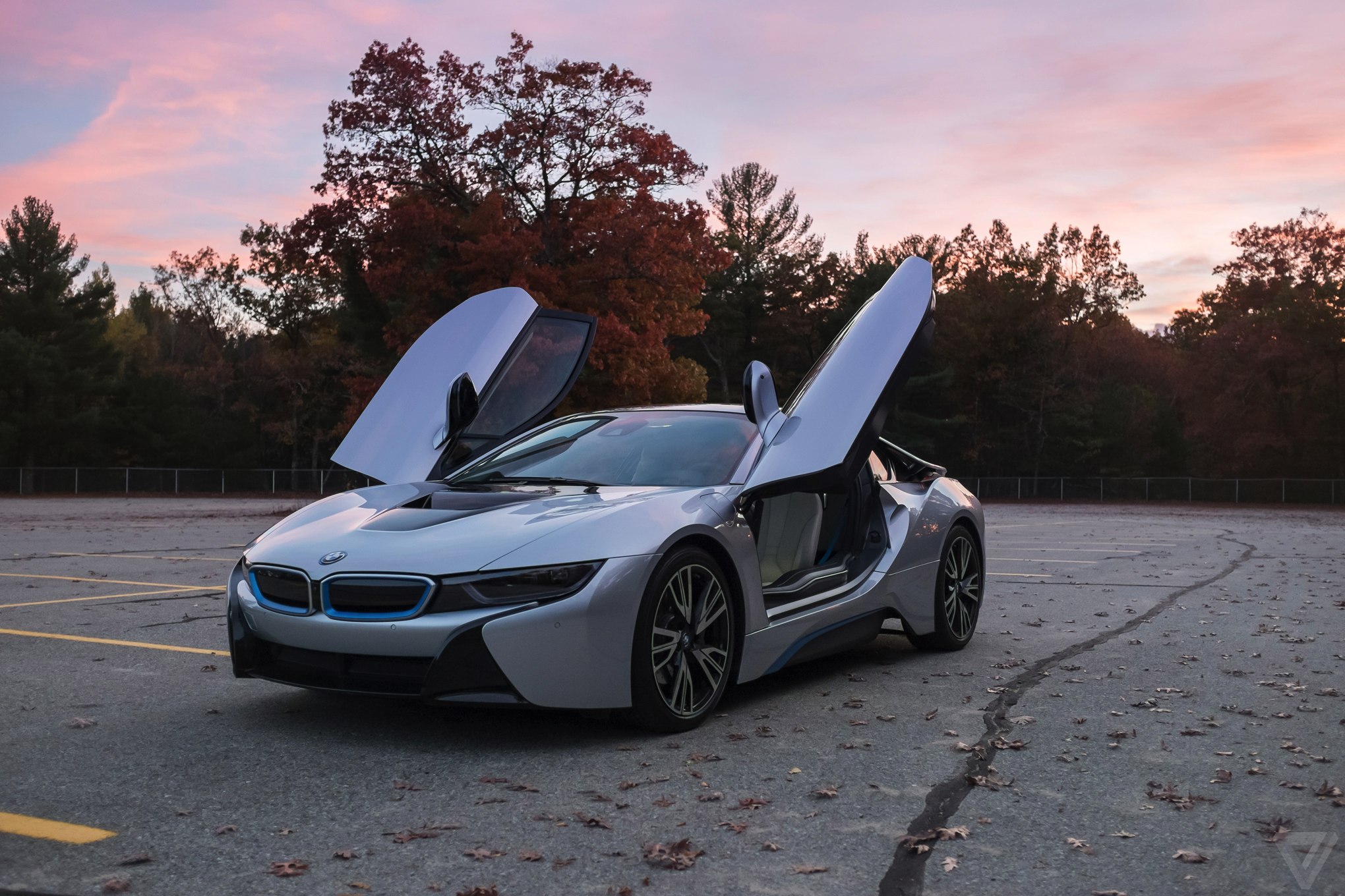 Description: A silver car with its doors open in a parking lot with trees in the background at sunset or dawn.