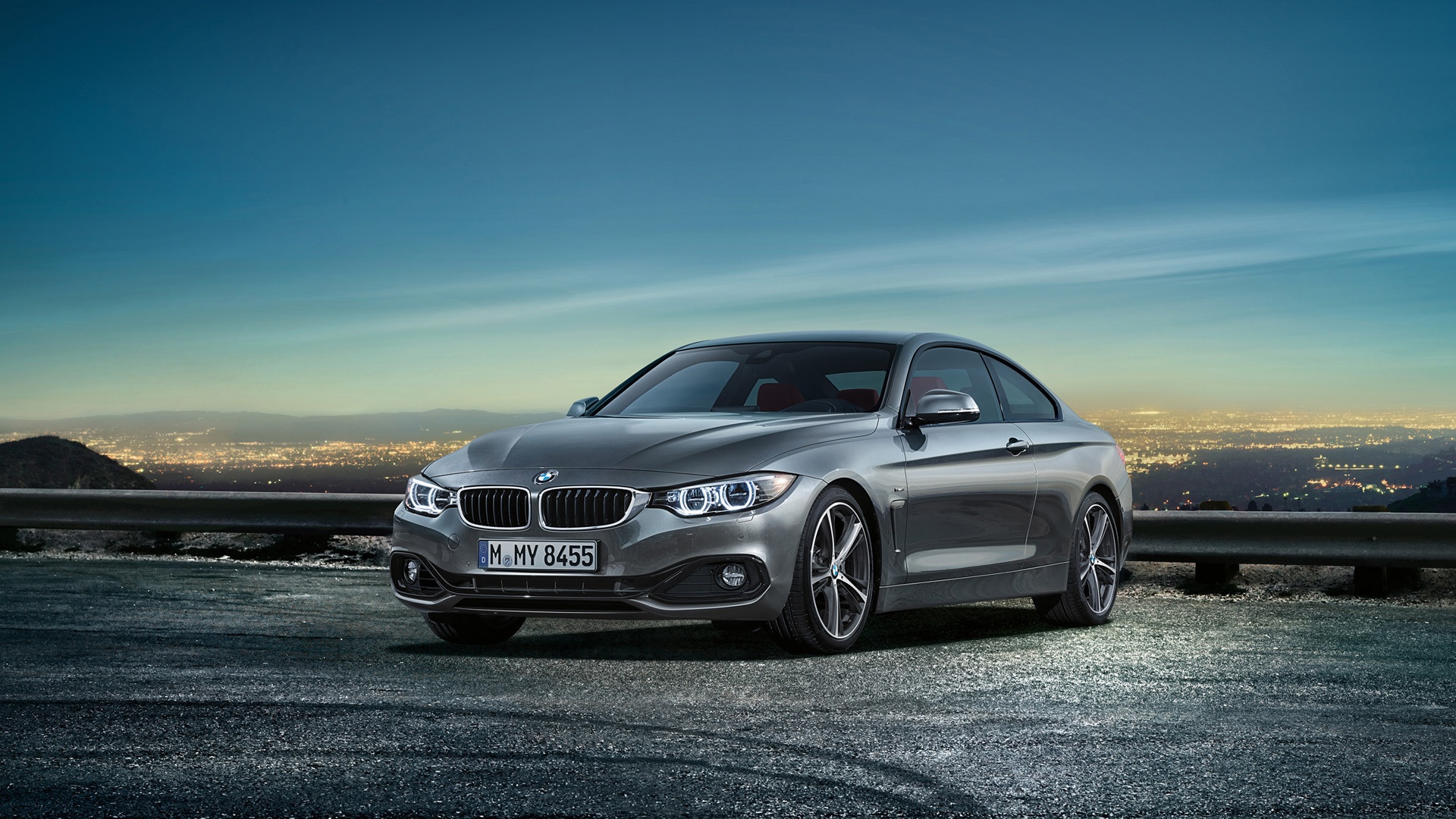 Description: A silver car parked on a road near a city skyline at night with a sky background and a blue sky.