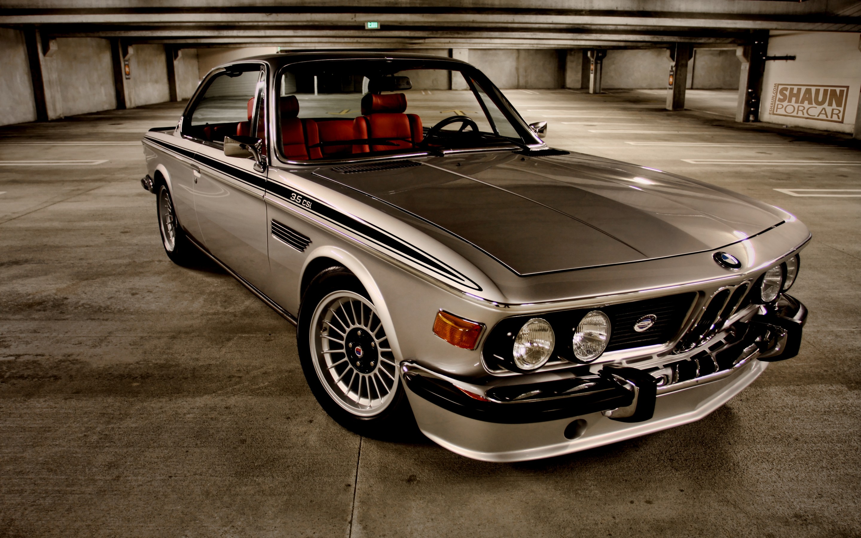 Description: A silver car parked in a parking garage with a red seat cover on the top of the car and a red seat cover on the front.