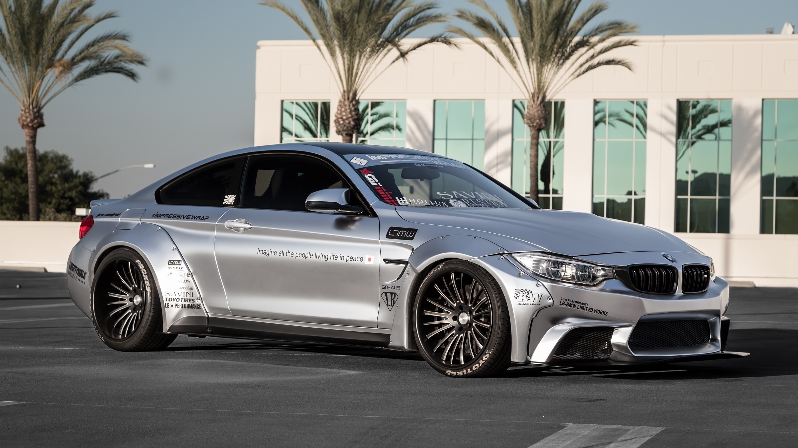 Description: A silver car parked in a parking lot next to a building with palm trees in the background and a building with a glass front door.