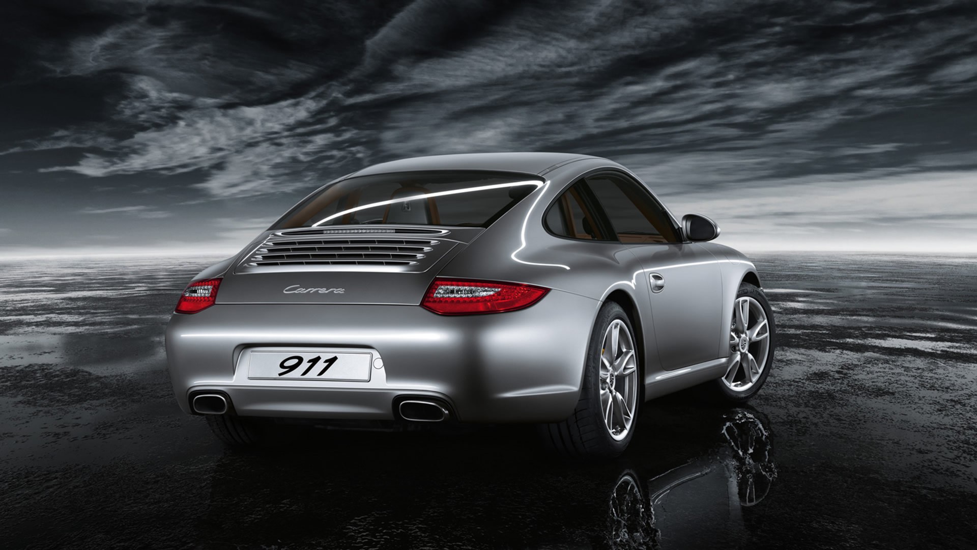 Description: A silver car parked on a wet surface under a cloudy sky with a reflection on the ground below it.