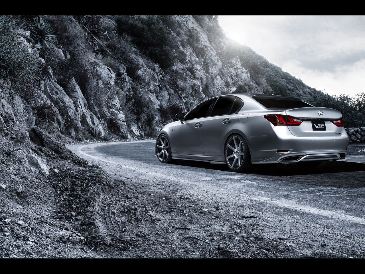 Description: A silver car driving down a road next to a mountain side with a sky background and a sun flare.