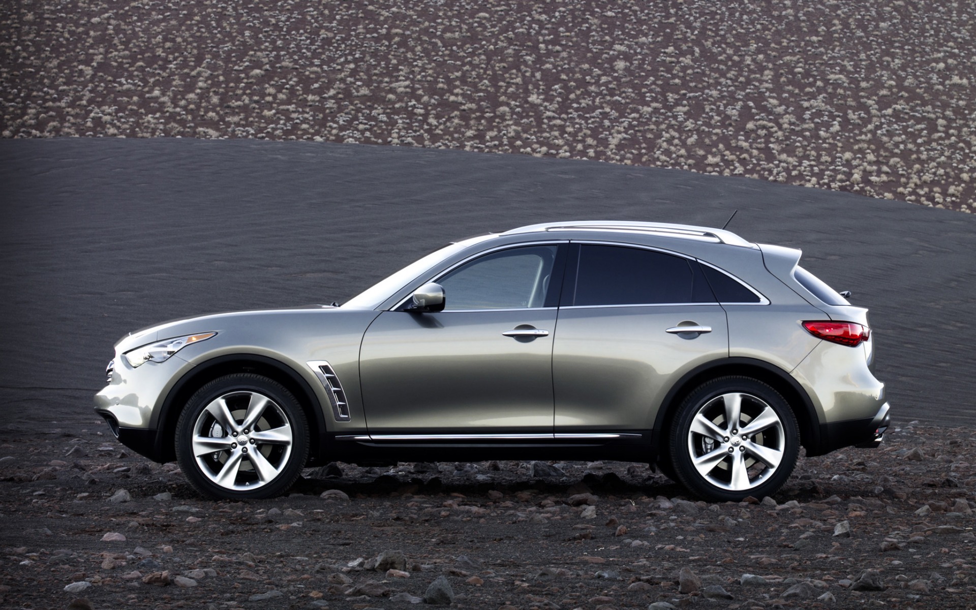 Description: A silver car parked on a rocky road near a hill and a hill side area with a hill in the background.
