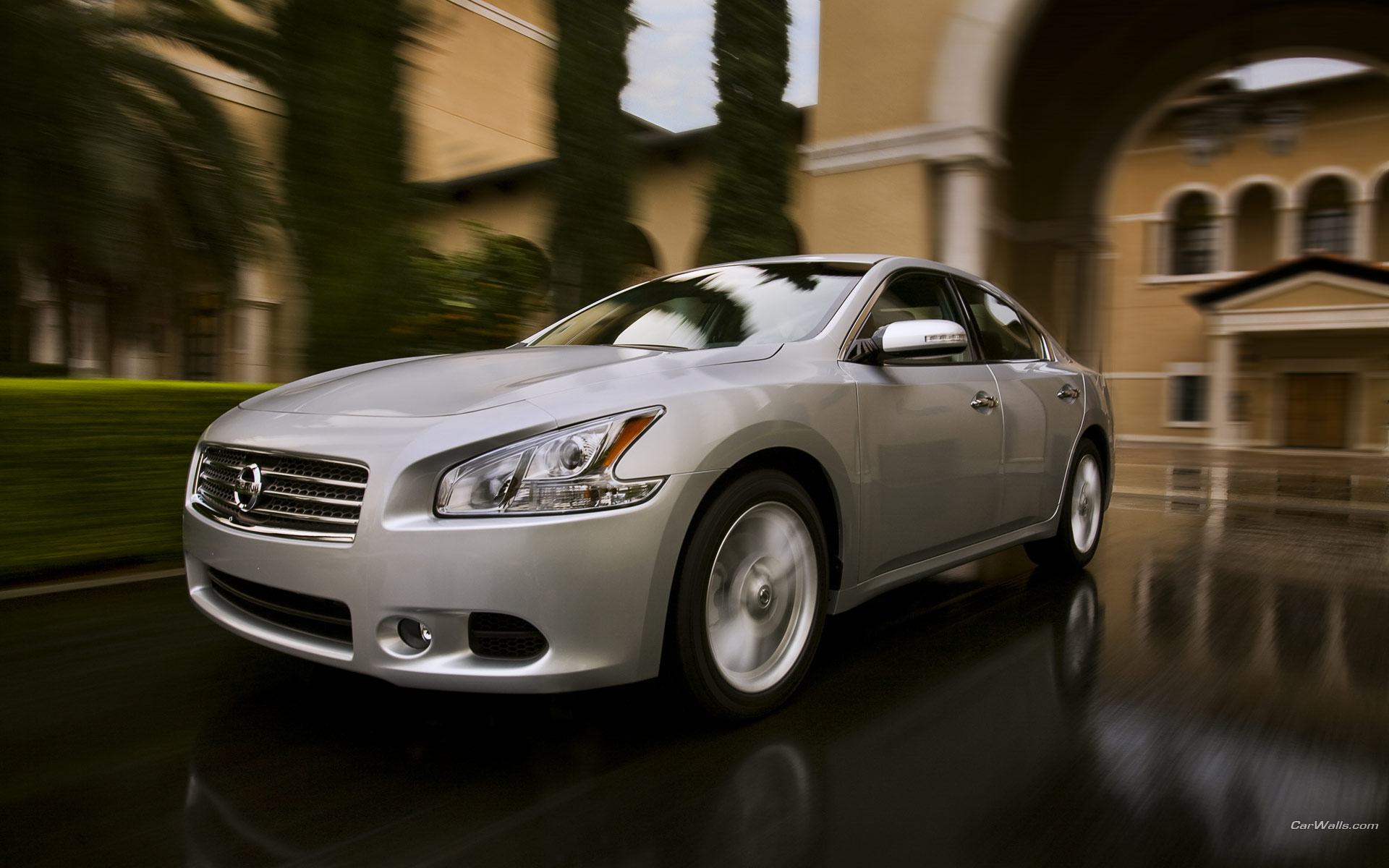 Description: A silver car driving down a street next to a building with a clock on it's side and a clock tower.