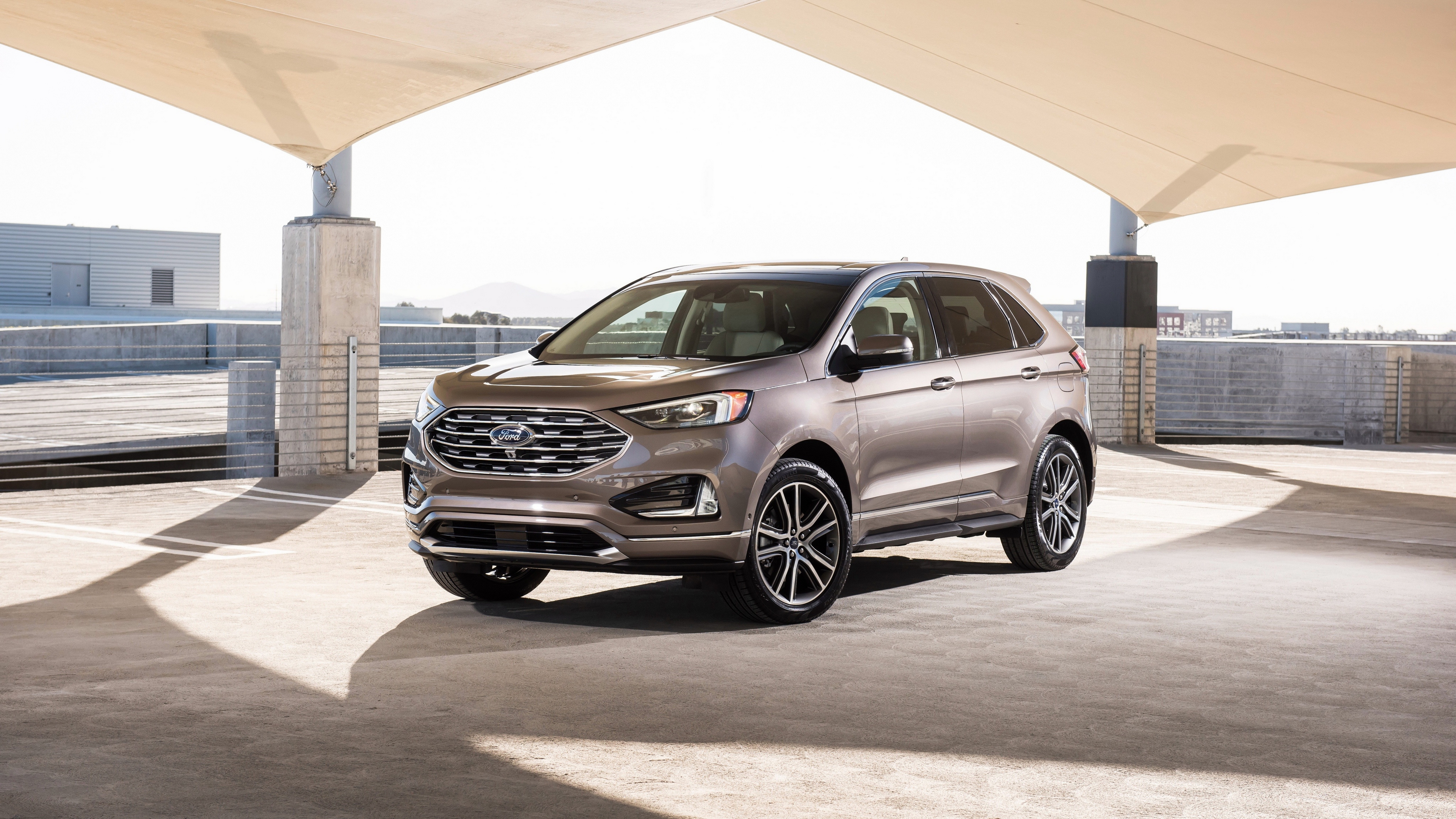 Description: A silver ford edge suv parked in a parking lot with a roof structure in the background and a building in the background.