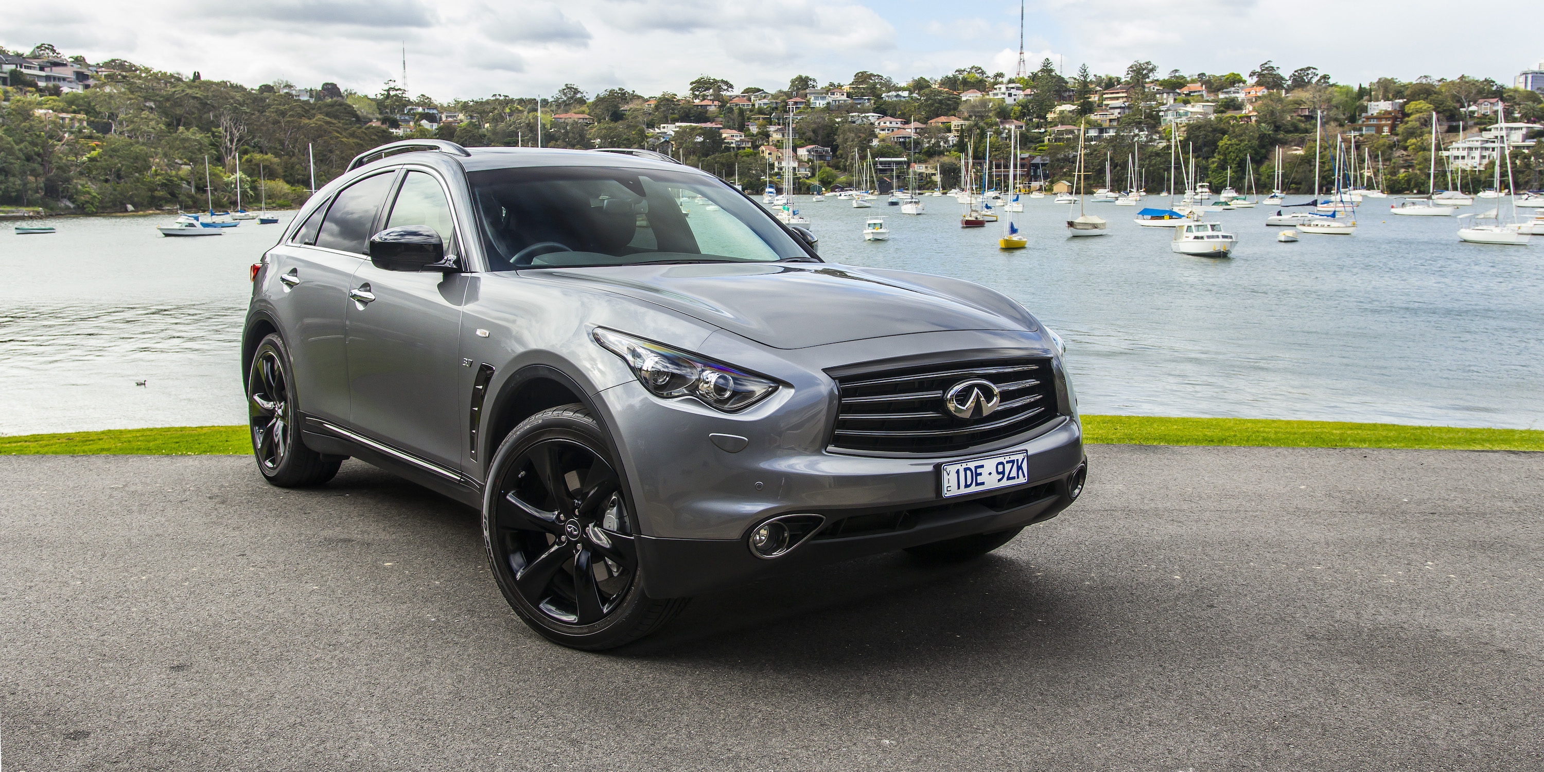 Description: A silver infiniti parked on the side of a road near a body of water with boats in the background.