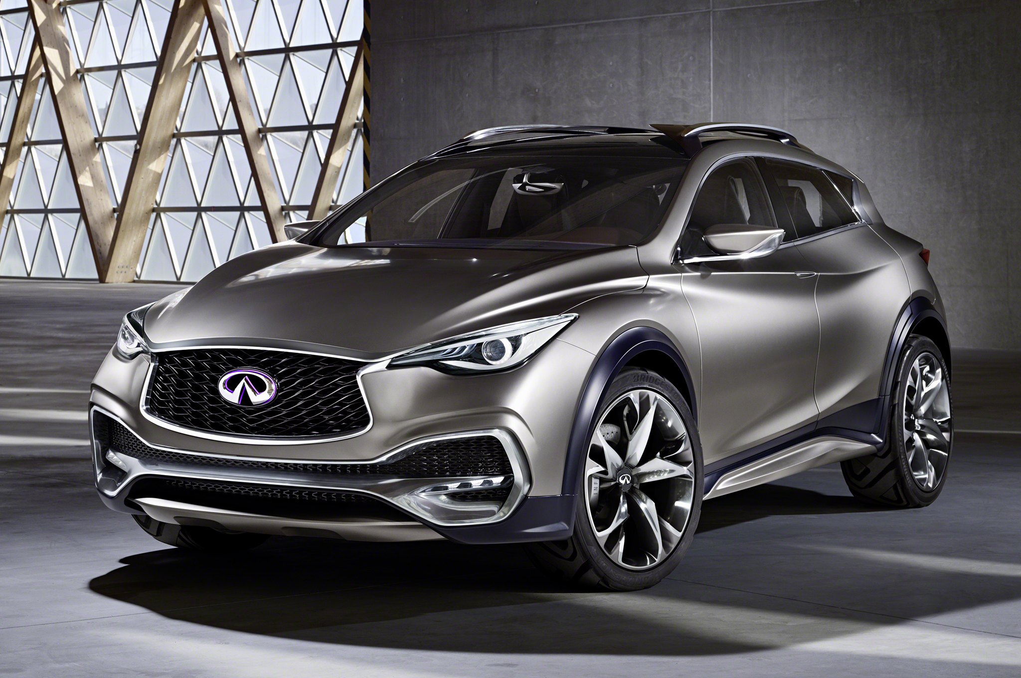 Description: A silver infiniti suv parked in a building with a large window in the background and a large glass wall.