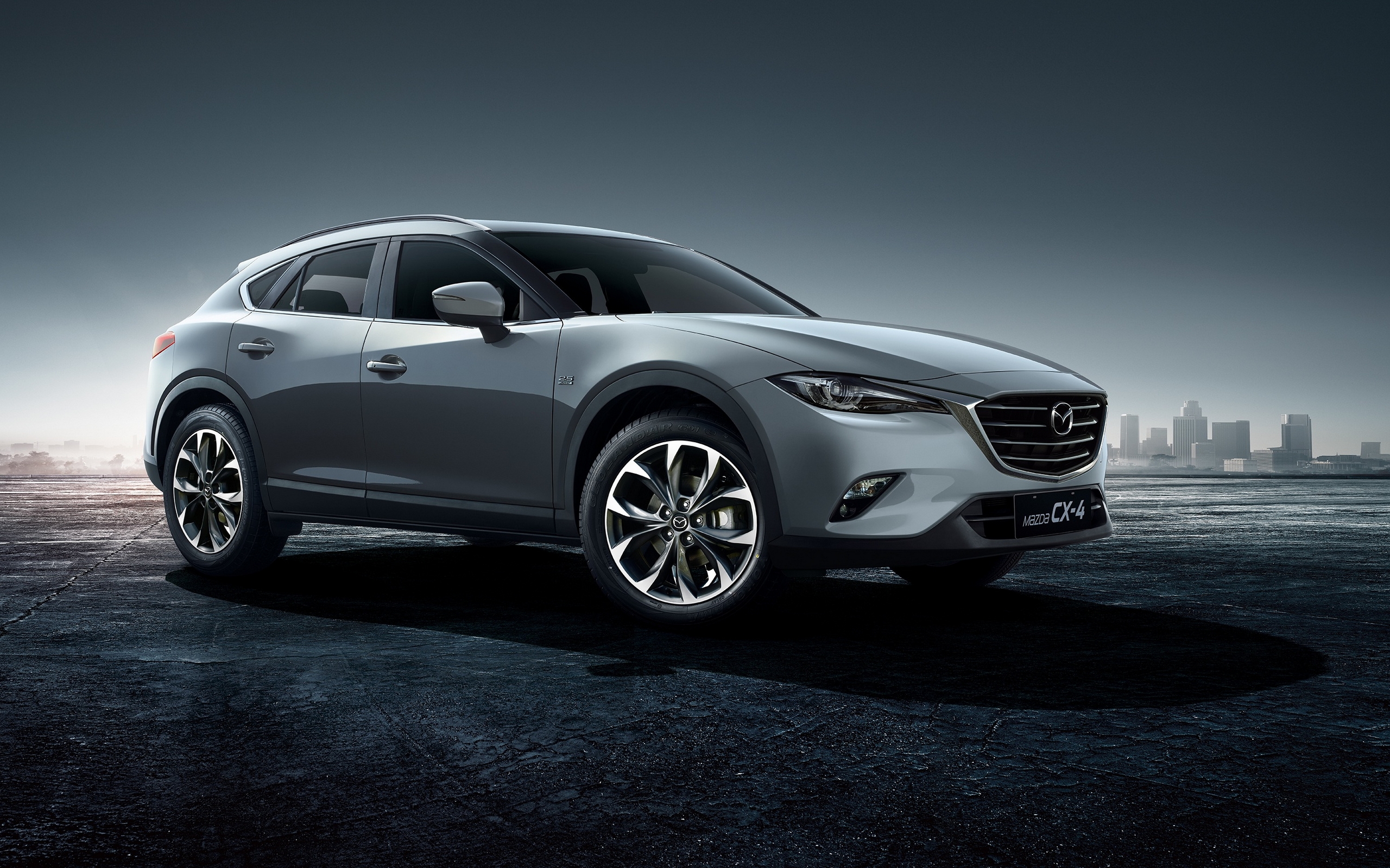 Description: A silver mazda car parked in a parking lot with a city skyline in the background at night time with a foggy sky.