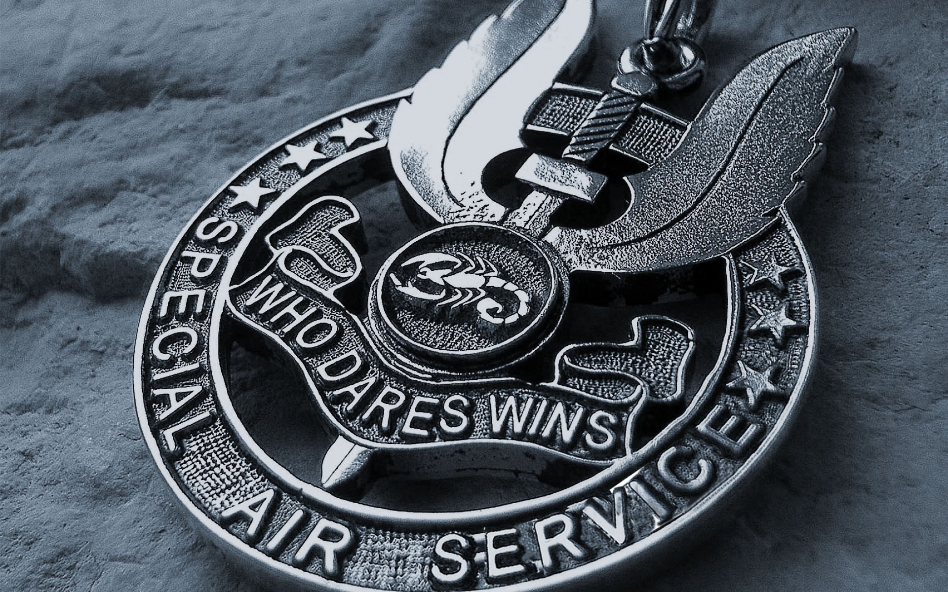 Description: A silver medal with a bird on it on a gray surface with a star and a ribbon around it.