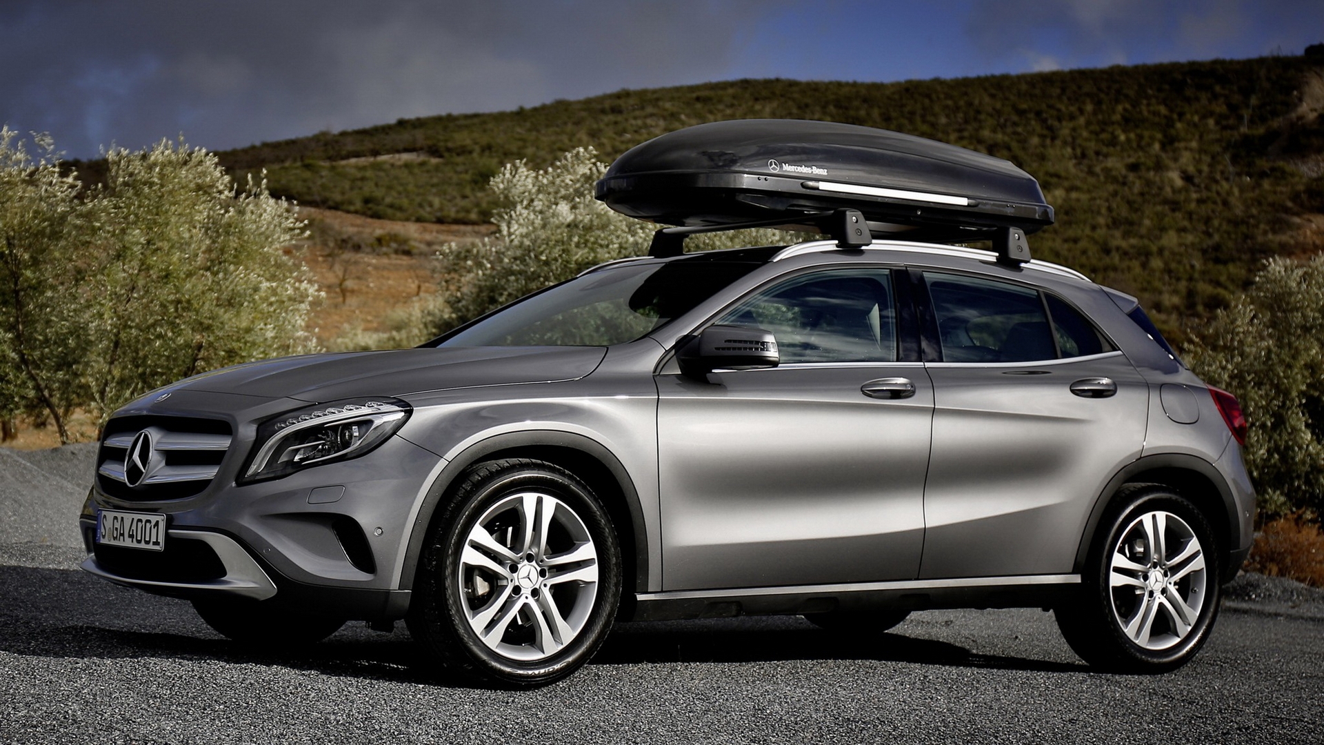Description: A silver mercedes benz suv with a surfboard on top of it's roof rack and luggage on the roof.