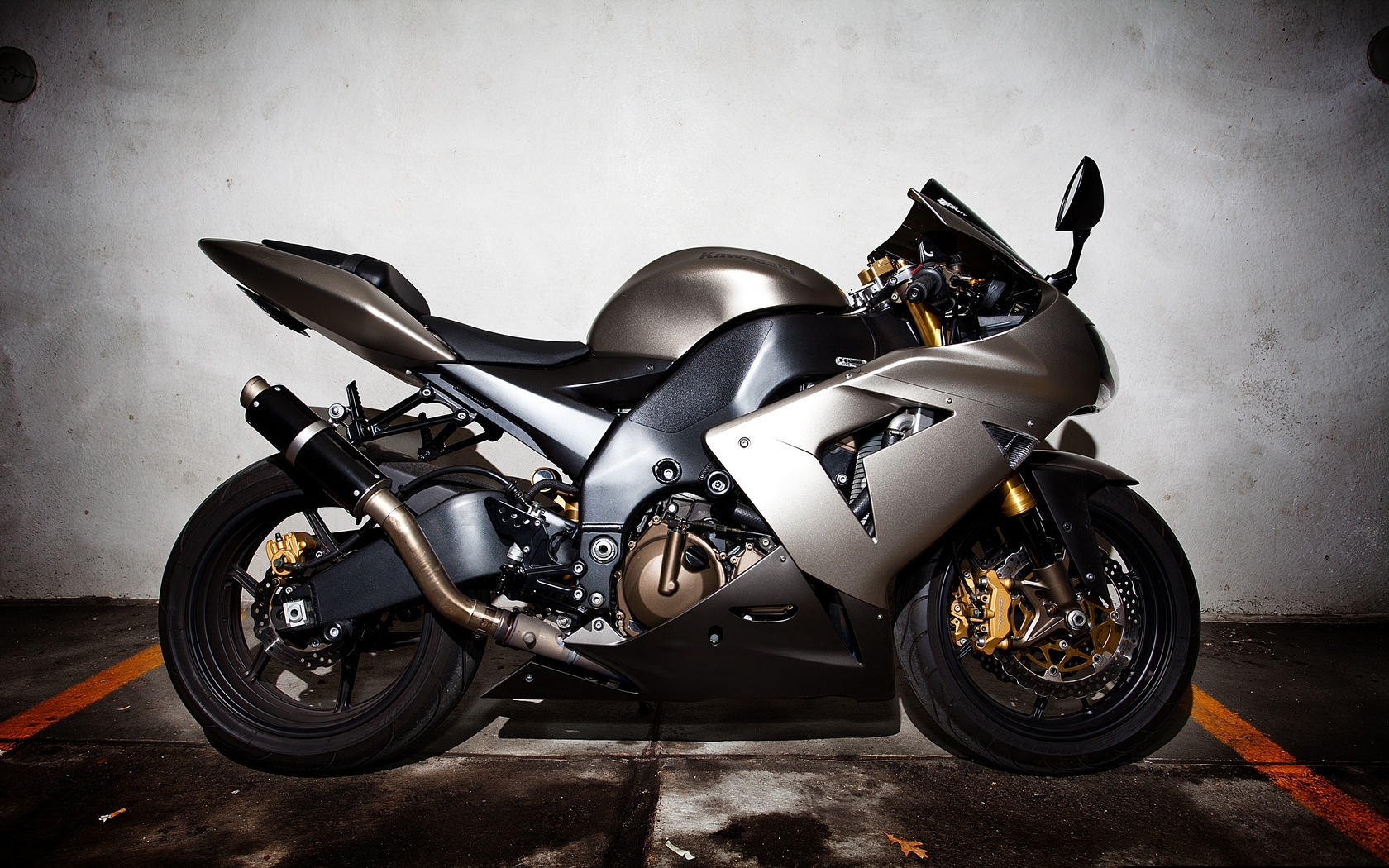 Description: A silver motorcycle parked in a parking space next to a wall and a wall behind it is a white wall.