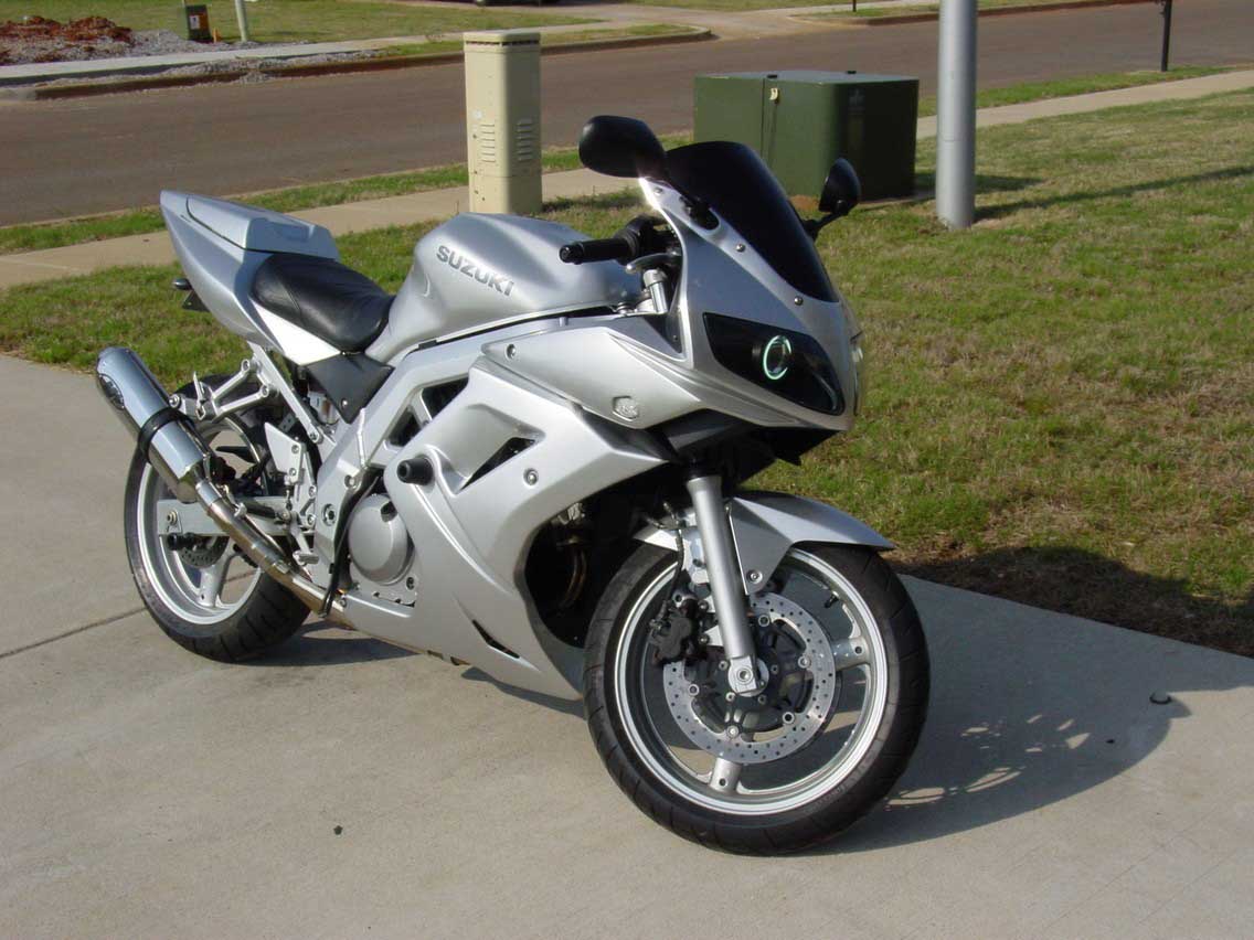 Description: A silver motorcycle parked on a sidewalk next to a street sign and grass area with a sidewalk and a sidewalk post.
