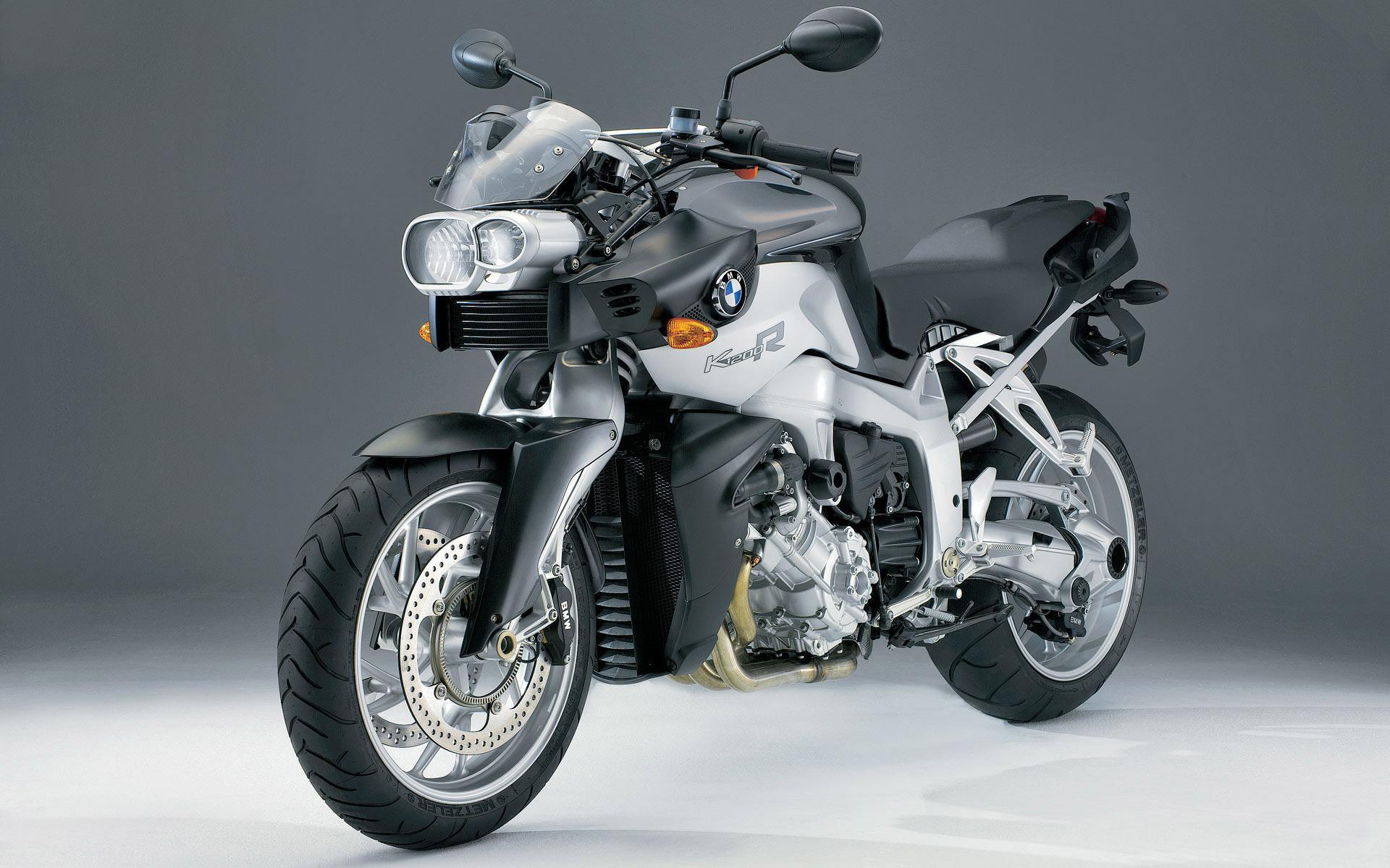 Description: A silver motorcycle is parked in a studio setting with a gray background and a black seat and backrest.