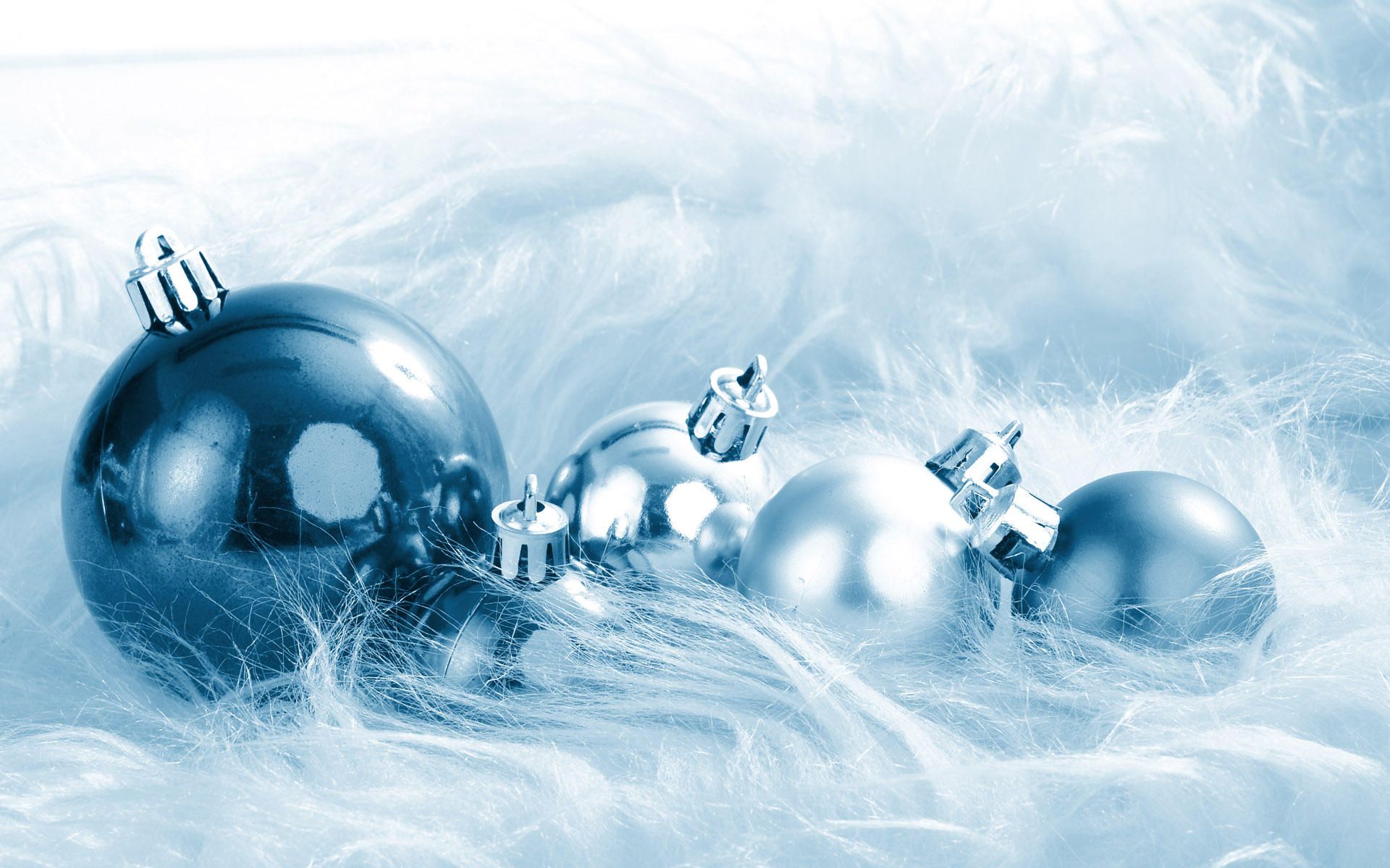 Description: A group of shiny silver and silver ornaments on a white fur background with a feathery backdrop and a white feather.