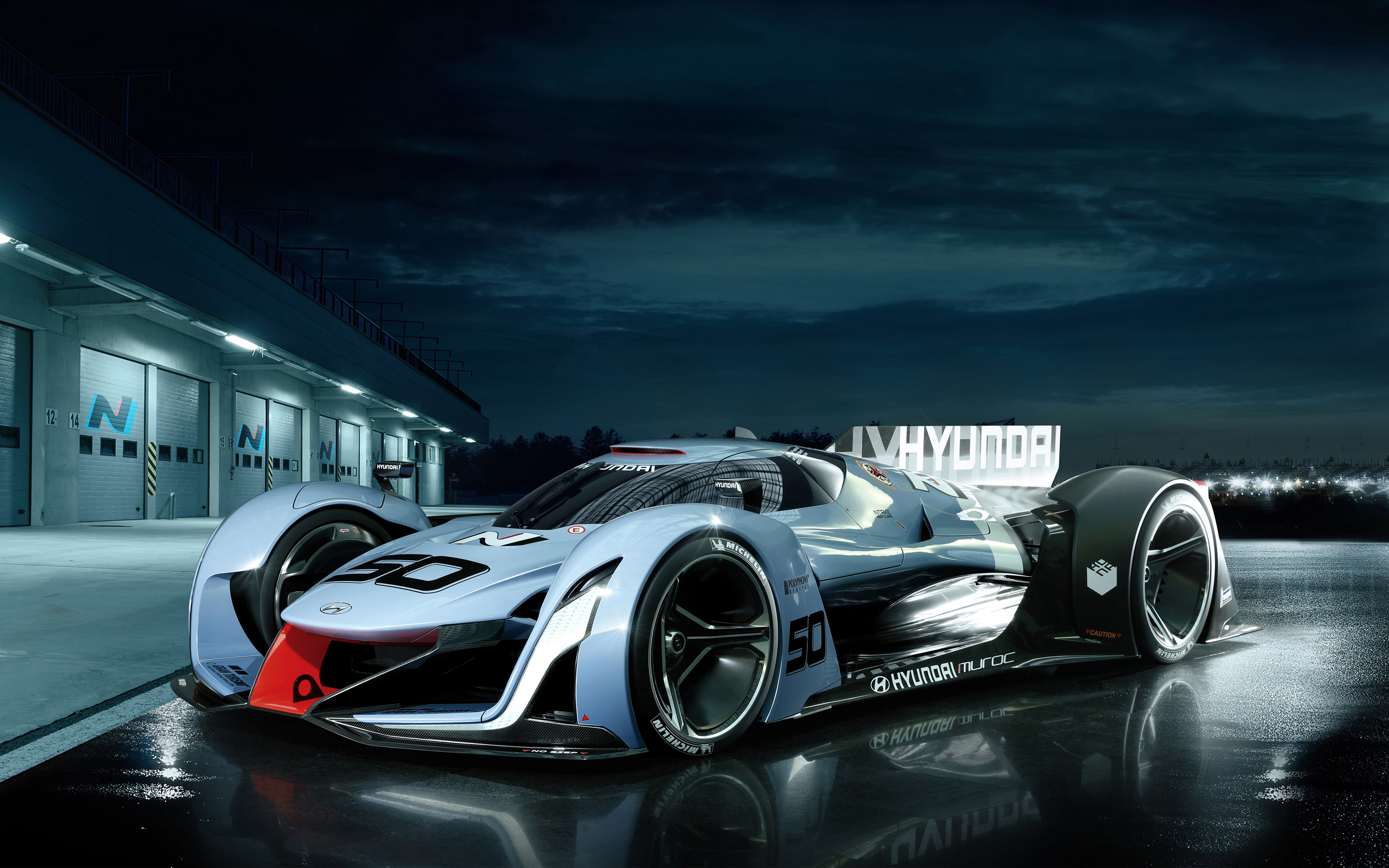 Description: A silver race car parked in front of a building at night with a sky background and a sign that reads autoway.