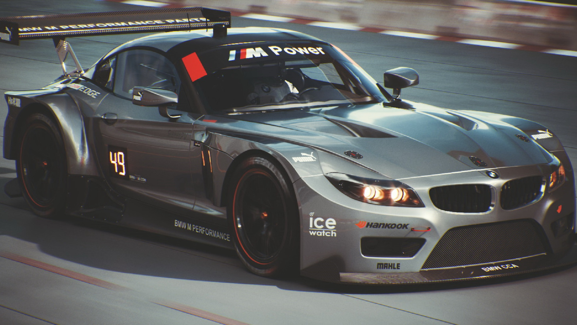 Description: A silver race car driving on a track with a red flag on top of it's headlight.