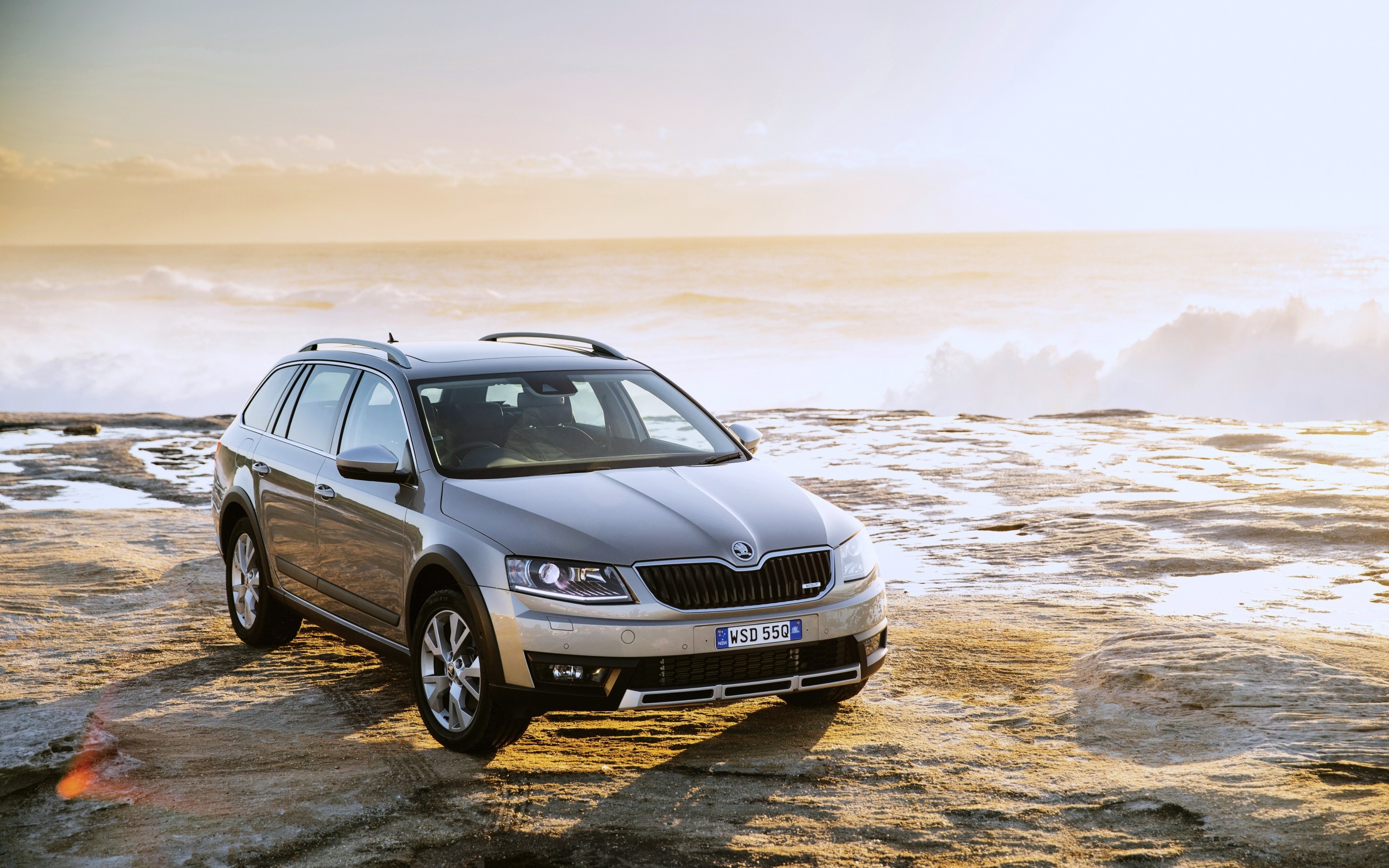 Description: A silver sked parked on a rocky beach next to the ocean with waves crashing in the background and a bright sun shining on the water.