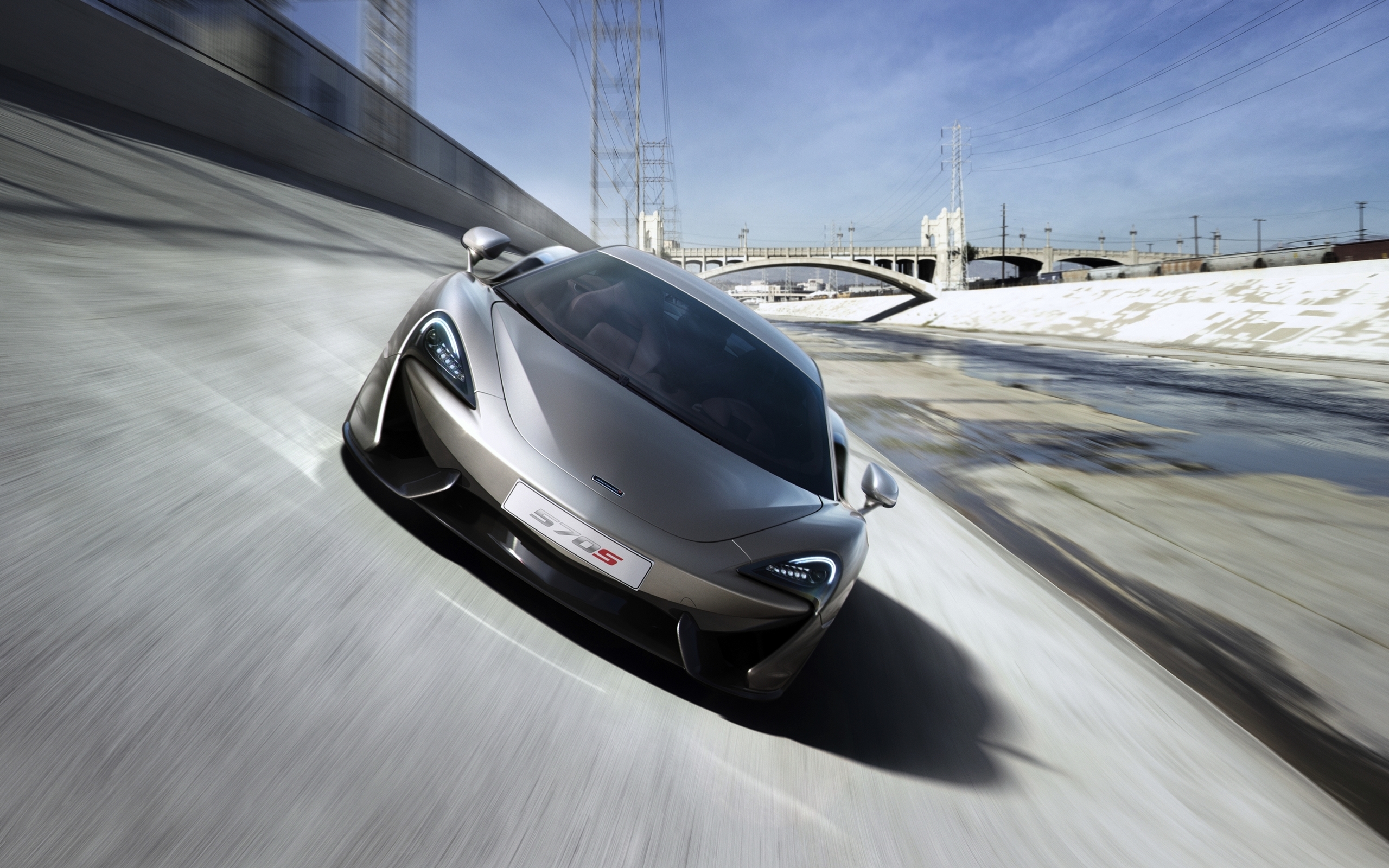 Description: A silver sports car driving down a road next to a bridge and power lines in the background with a bridge in the distance.