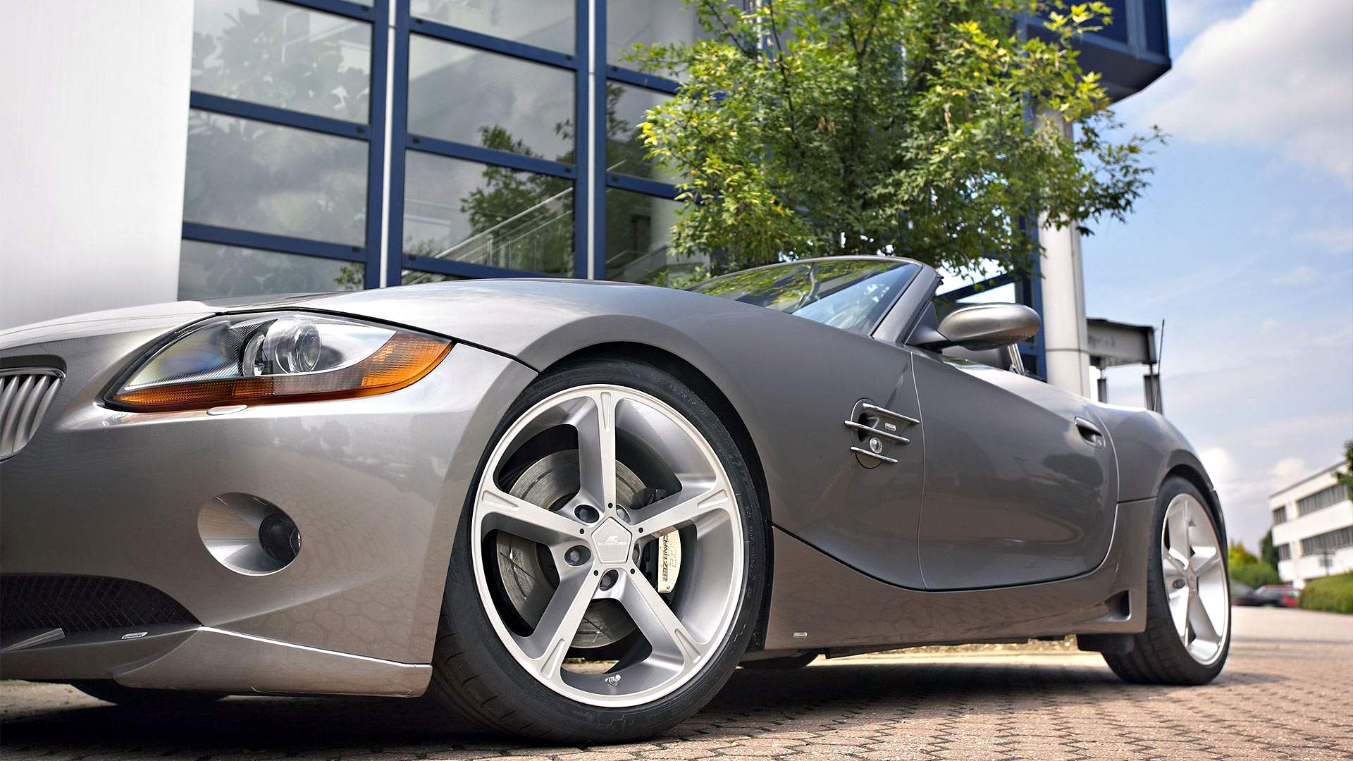 Description: A silver sports car parked in front of a building with a tree in the background and a blue sky.