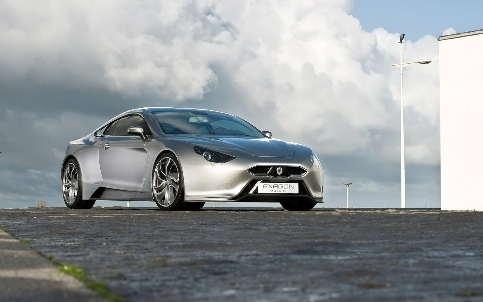 Description: A silver sports car parked in front of a building with a cloudy sky in the background and a white building.