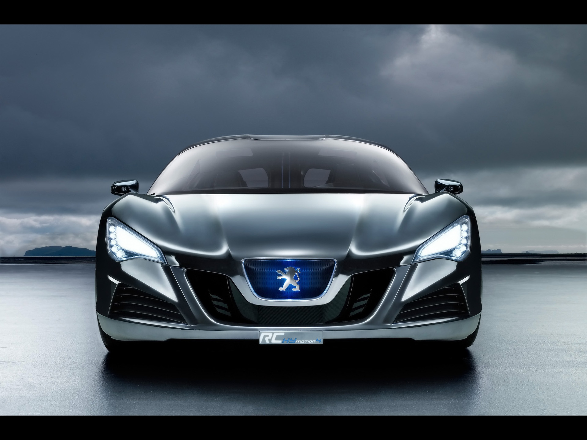 Description: A silver sports car parked in a parking lot with dark clouds in the background and a person standing next to it.